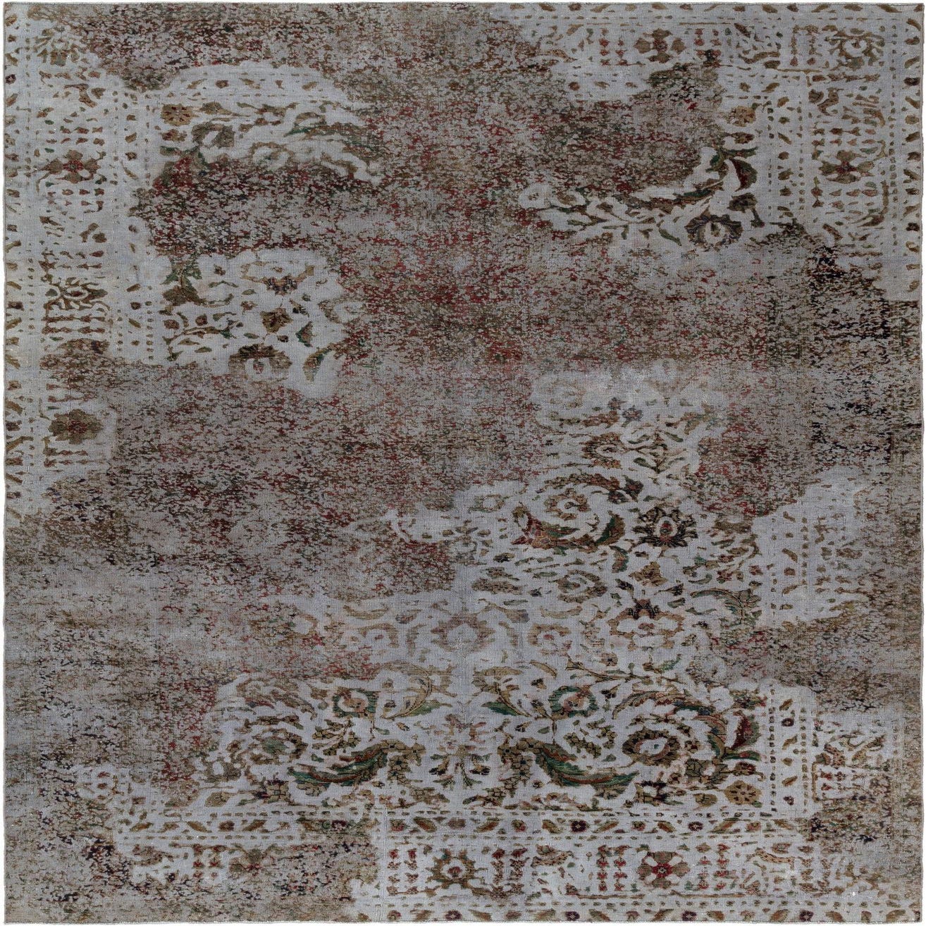 A 6x9 rectangular grey Persian rug with an antique, distressed floral and medallion pattern in muted red, green, and brown tones.