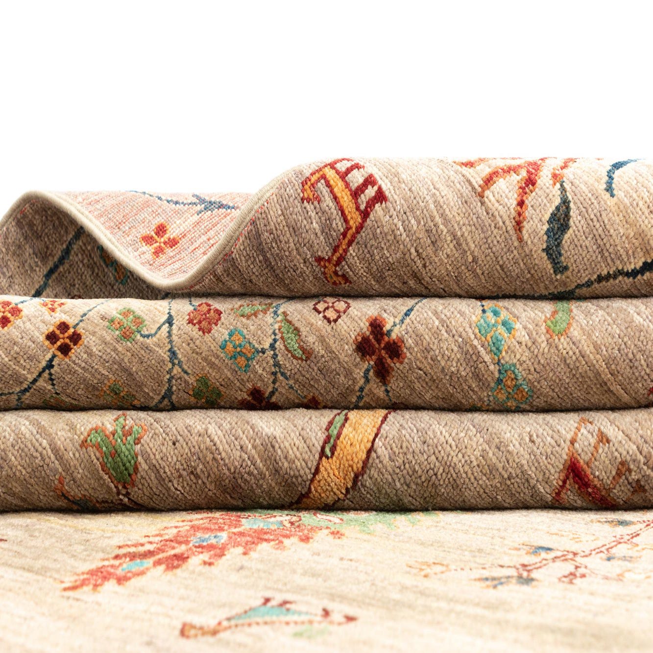 Ideal for an array of decor scenarios, this rug can serve as a focal point in a living room with minimalist or modern furnishings, adding a touch of artistry and color. In a more traditional setting, its cultural motifs complement rich wooden accents and leather pieces, while its balanced tones can tie together an eclectic mix of decor elements in a bohemian-styled space. The Ariana Ziegler rug is a versatile choice that brings both heritage and handcrafted artisanship into the home.