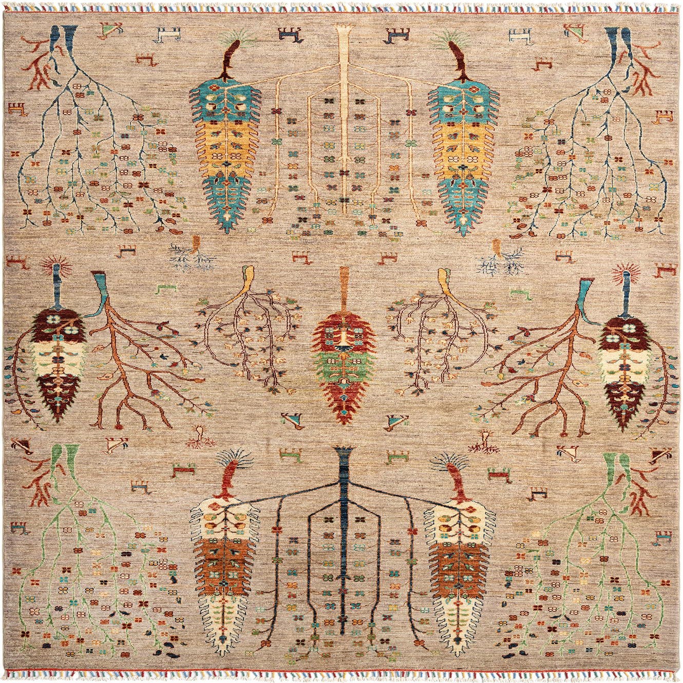 The Ariana Ziegler rug in size 7x10 is a handcrafted piece made of 100% wool, boasting a distinctive pattern that showcases symmetrical motifs reminiscent of traditional tribal designs. The rug's pattern includes detailed representations of feather-like forms and geometric accents that add depth and cultural significance to the overall design.