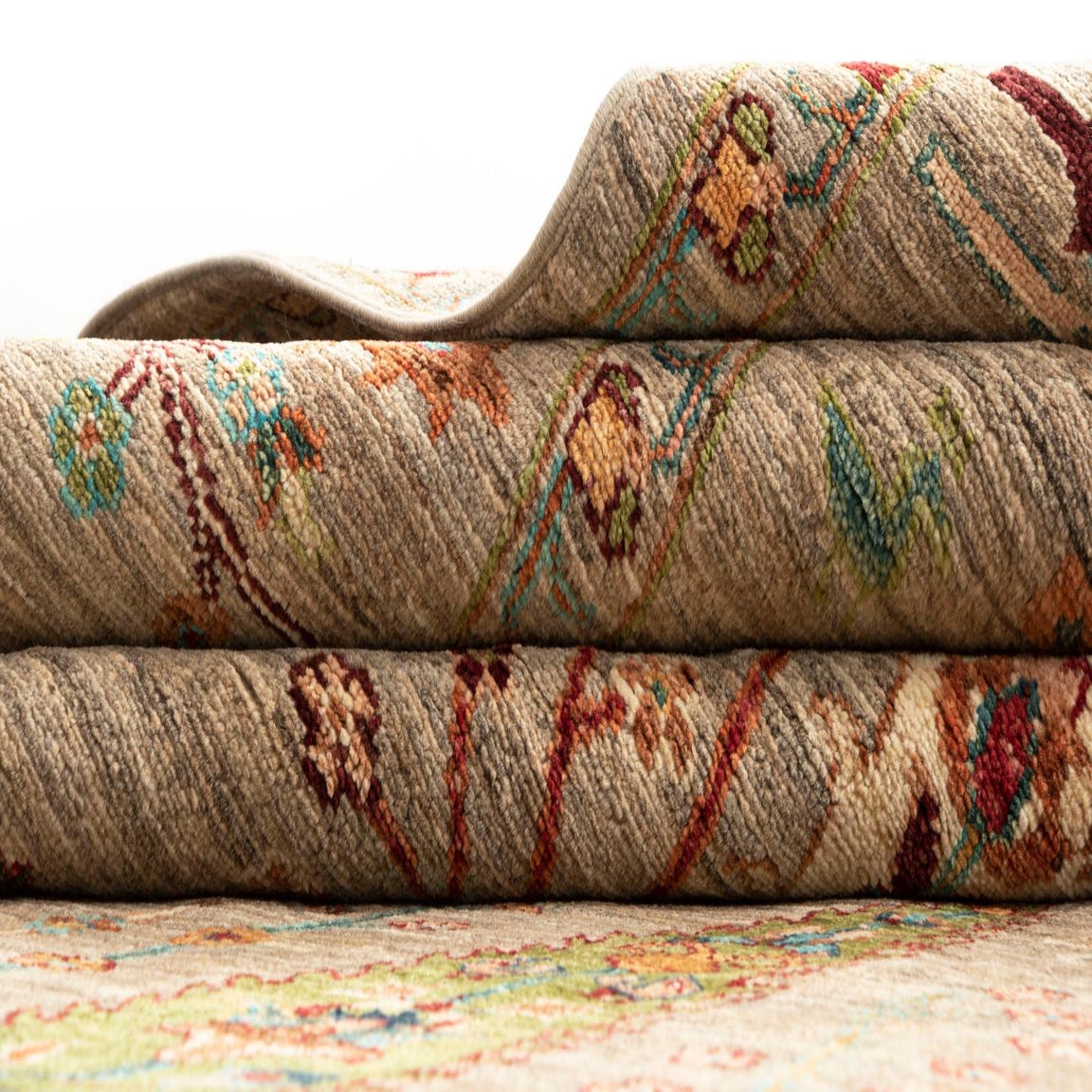 Primary color is Grey. Colors in this rug include: Grey, Grey, Beige, Orange, Green, Dark Blue.