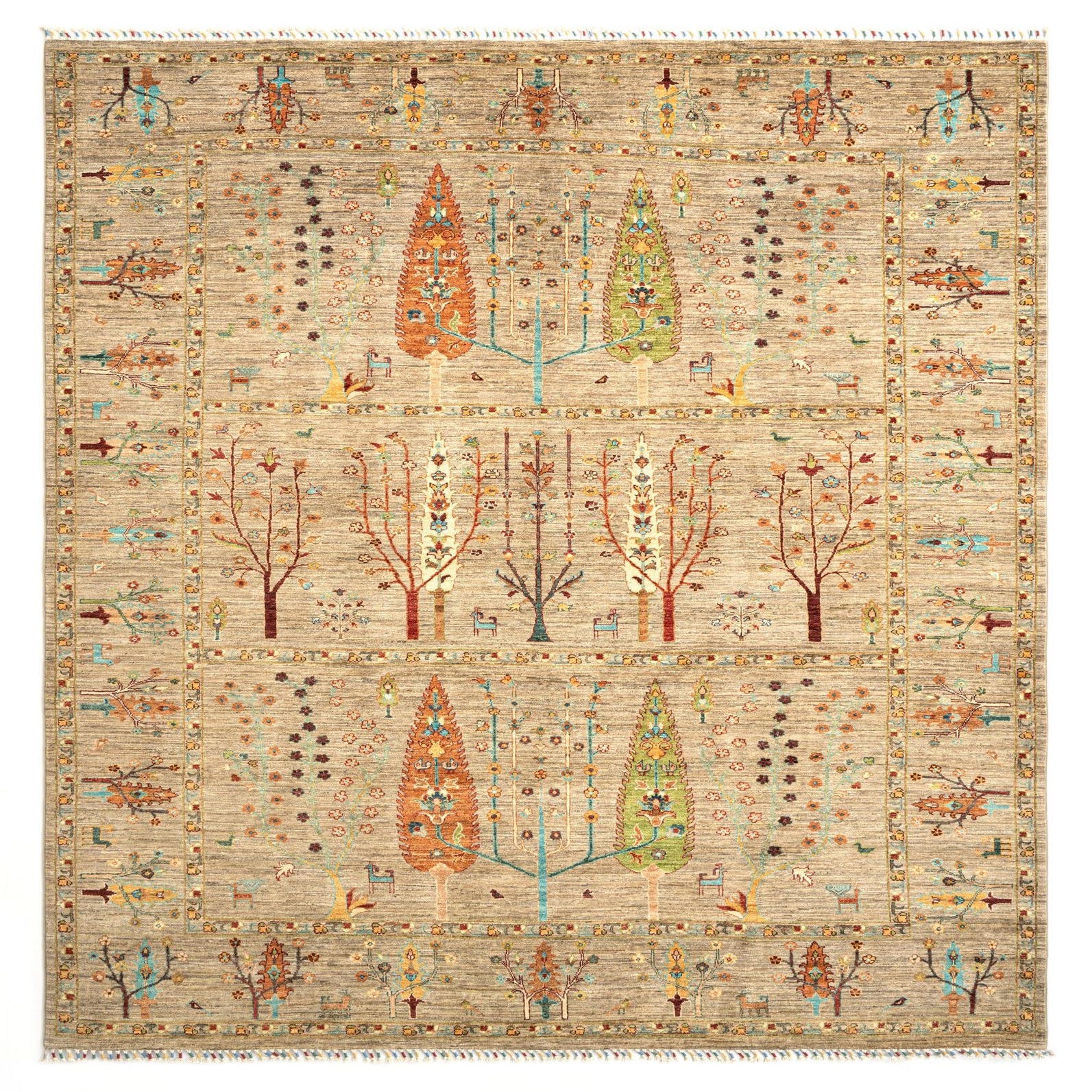 A rectangular 8x10 grey Persian wool rug with a vibrant tree of life pattern and intricate border.