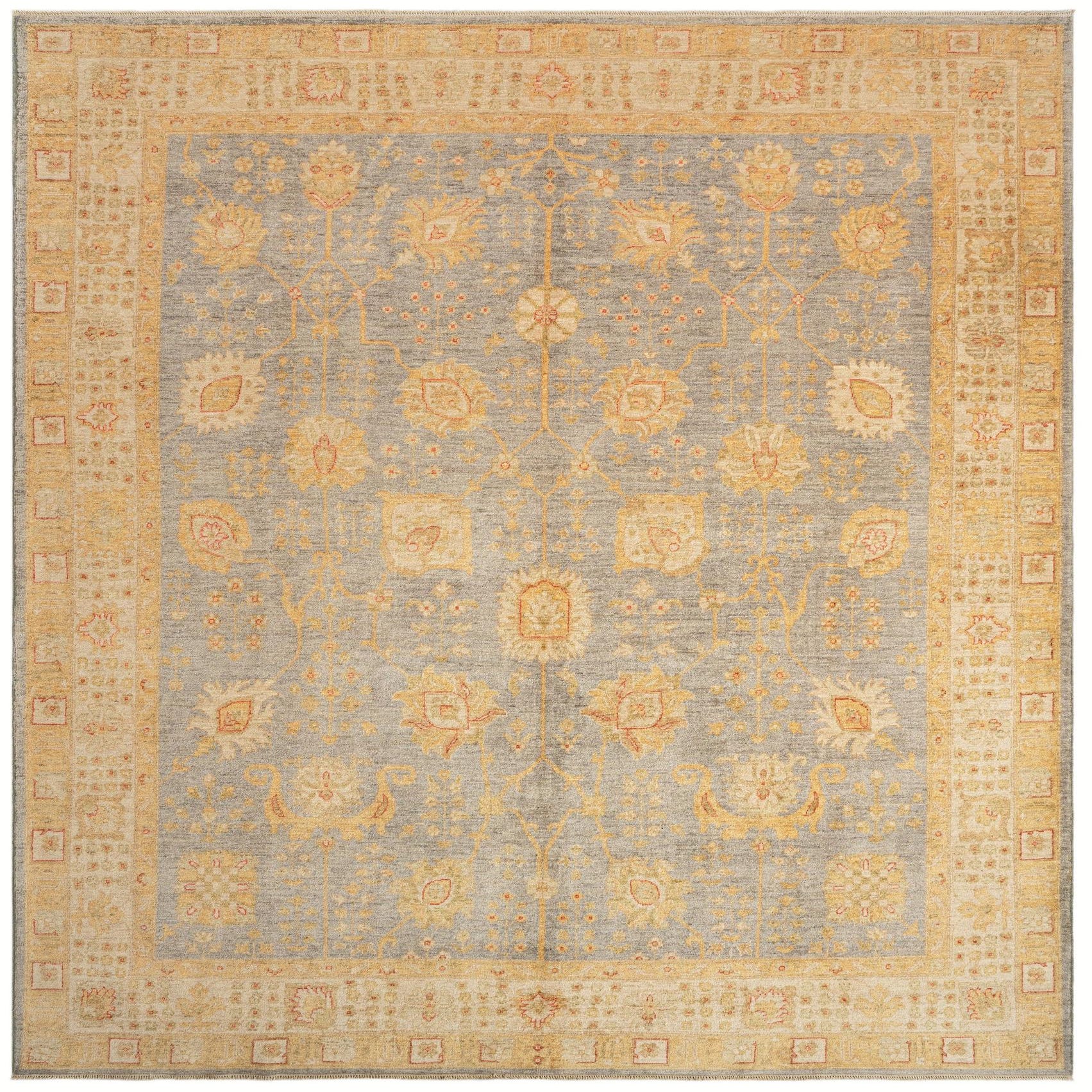 A rectangular 8x10 grey Persian wool rug with a detailed gold and orange floral border and central medallion.