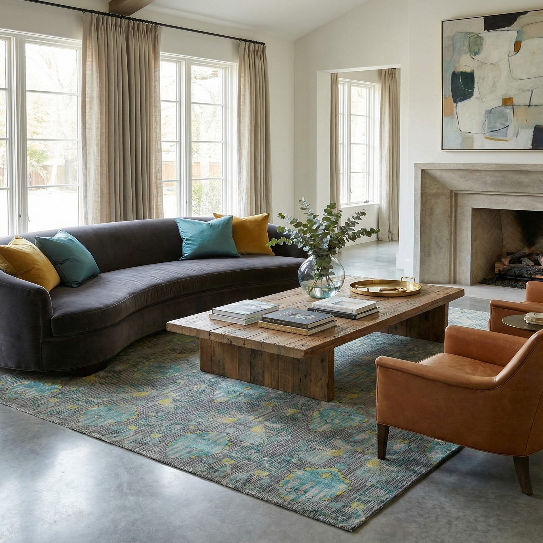 This Modern Manshu piece would serve as a focal point in a variety of interior design scenarios. It is well-suited for modern and transitional spaces where its balanced design can harmonize with both minimalist and eclectic decors. It could anchor a living room under a sleek coffee table or add a sophisticated layer to a dining area, complementing both neutral and bold color schemes with its versatile palette.