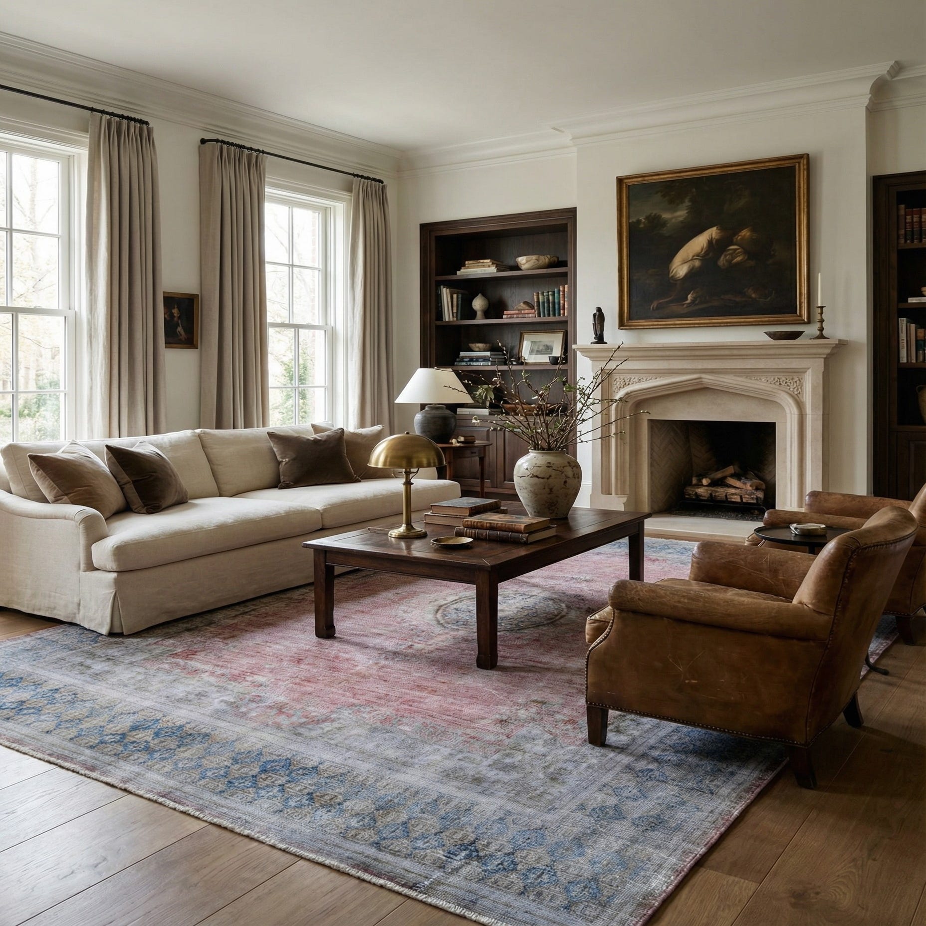 This rug is well-suited for a variety of interior design styles, including traditional, transitional, and contemporary spaces. It can serve as the focal point in a living room or dining area, or add a touch of warmth to a bedroom or home office. Its versatile design allows for placement in settings that appreciate a splash of subdued color and a nod to antique motifs.