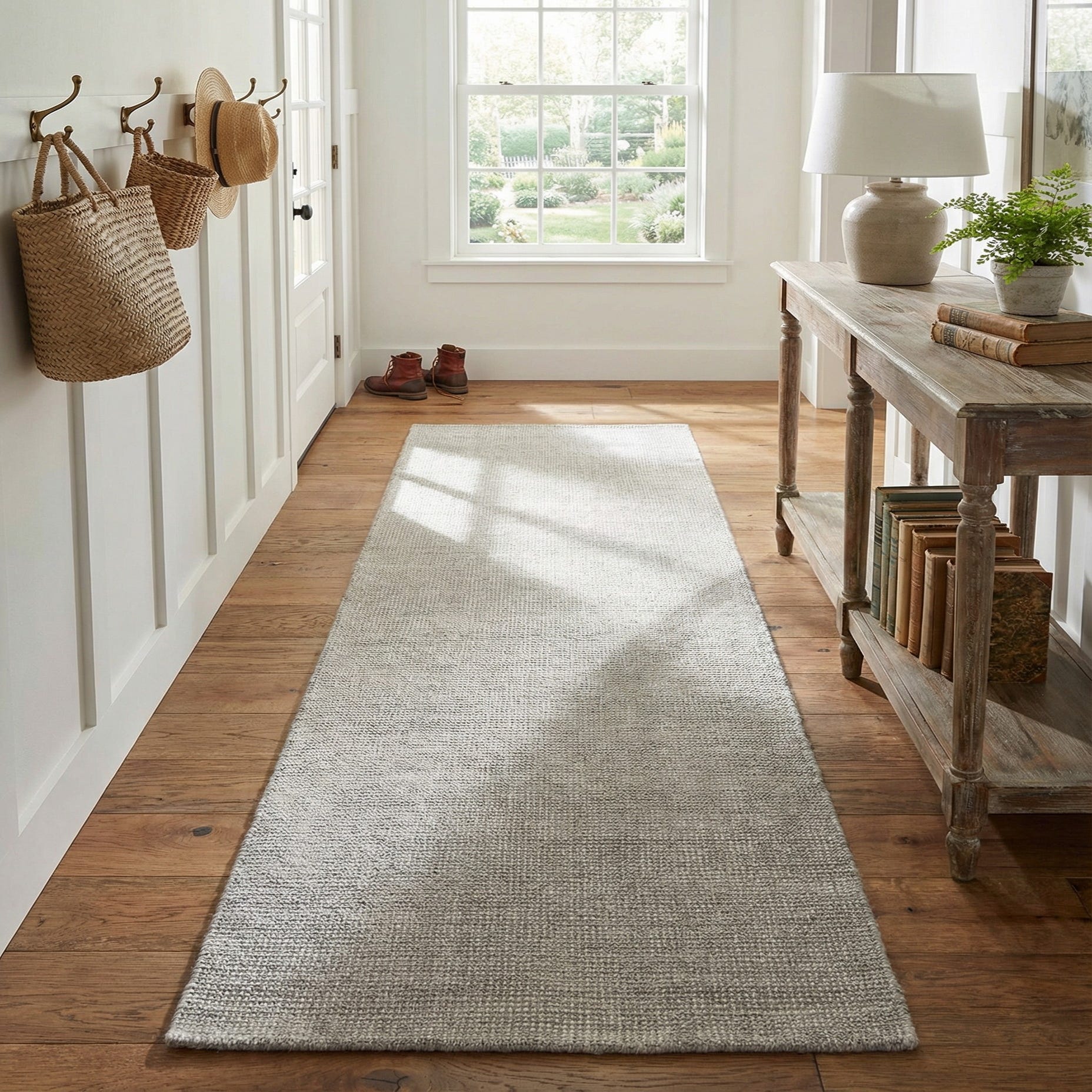 This neutral, textured runner works well in a variety of interiors. Place it in an entry or hallway to elongate a space, use it along a kitchen galley, or layer it beneath a long console to add softness underfoot. It pairs naturally with painted cabinetry, warm oak floors, and transitional or Scandinavian furnishings, and it provides a calm backdrop for patterned upholstery or wood accents.