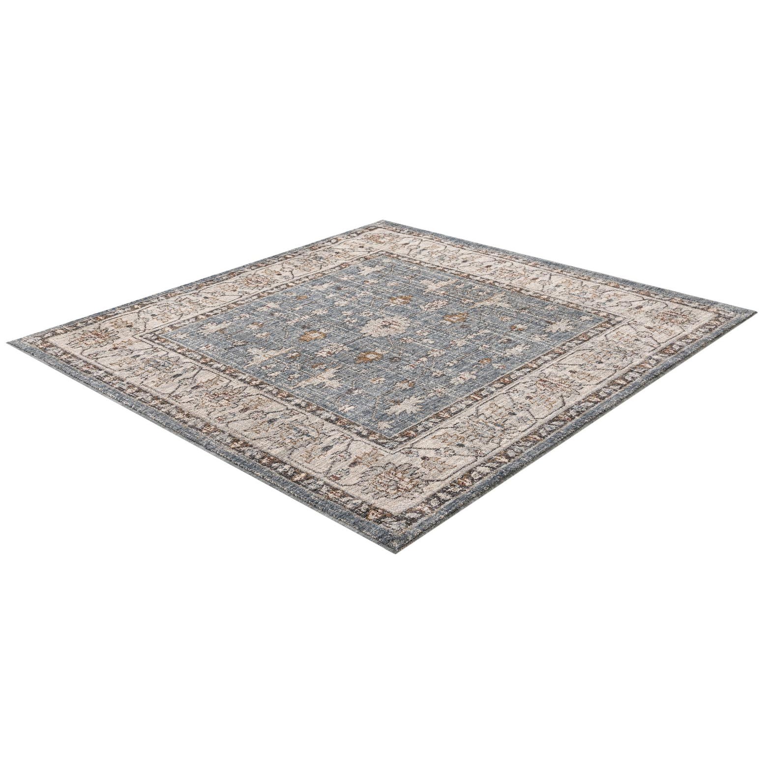 A 5' 3 x 5' 3 square blue area rug featuring an intricate traditional pattern with a light border, suitable for indoor use.