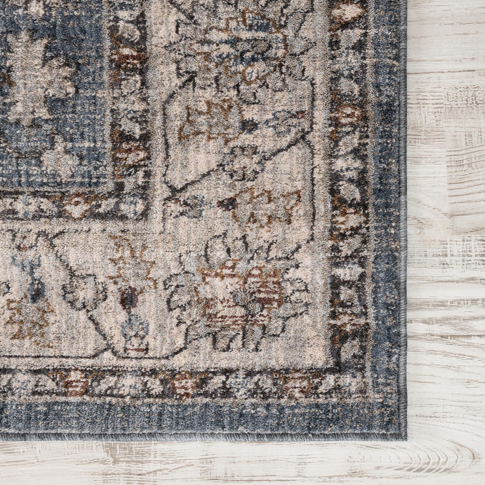 Primary color is Harbor Blue. Colors in this rug include: Harbor Blue, Gray, Ivory, Light Brown, Black.
