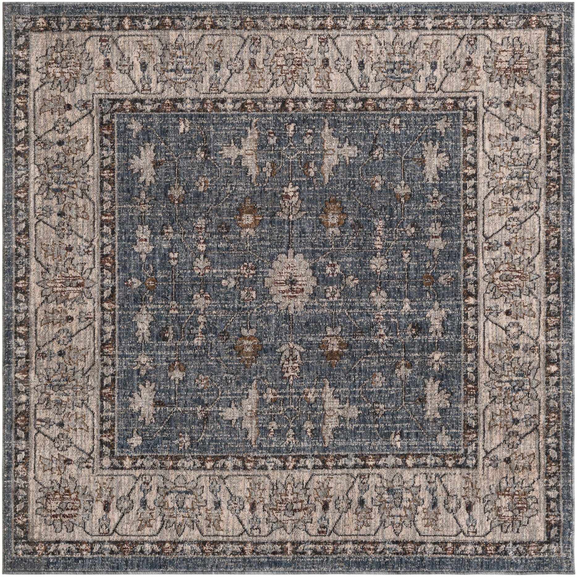 A 5' 3 x 5' 3 square blue area rug featuring an intricate traditional pattern with a light border, suitable for indoor use.