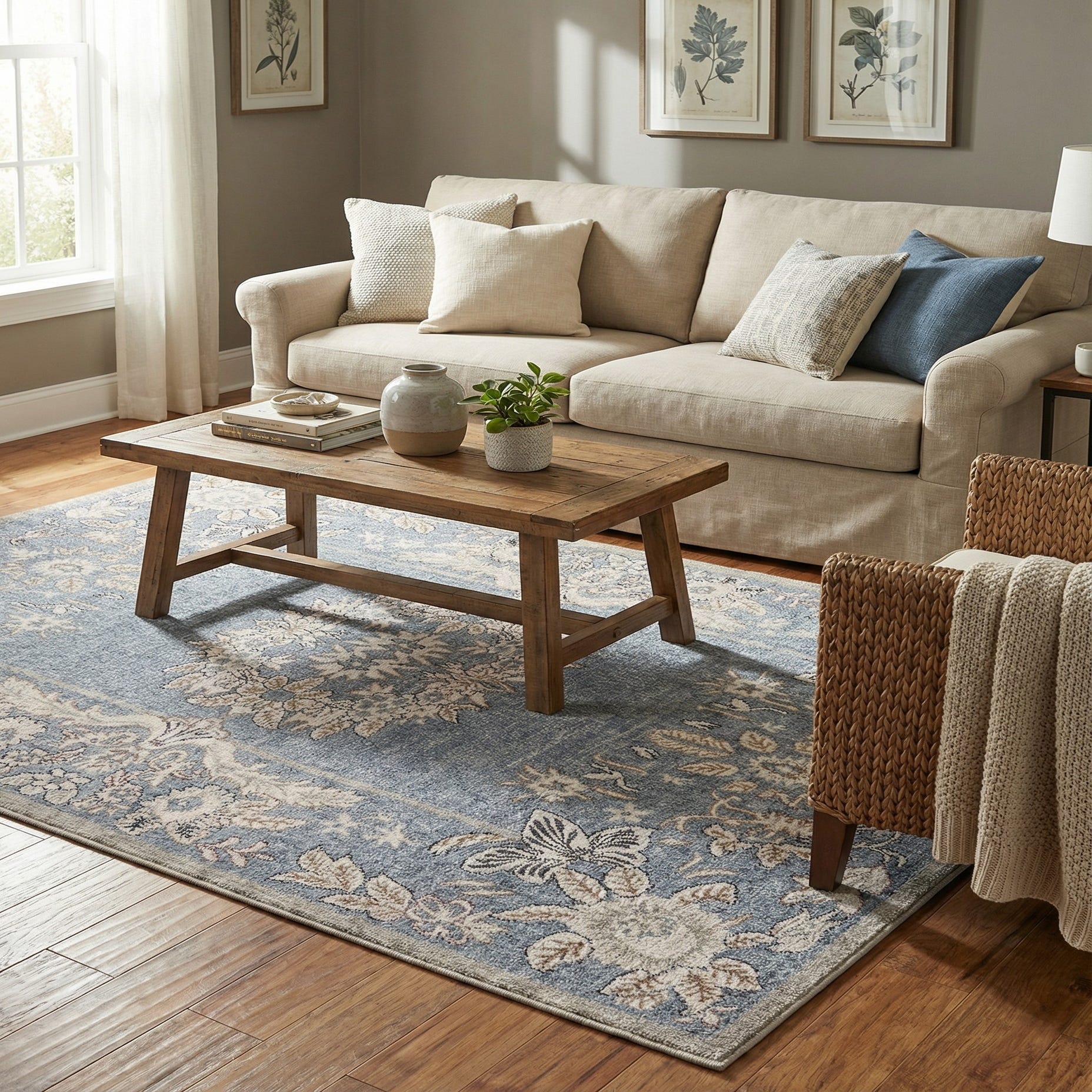 This rug fits well in transitional and coastal-inspired rooms as easily as in traditional or modern farmhouse settings. Use it to anchor a seating area in the living room, layer it under a bed to warm a bedroom, or place it beneath a dining table for a softer, more relaxed floor plane. It pairs nicely with light wood tones, linen upholstery, navy accents, and metal finishes in brass or matte black for a balanced, approachable look.