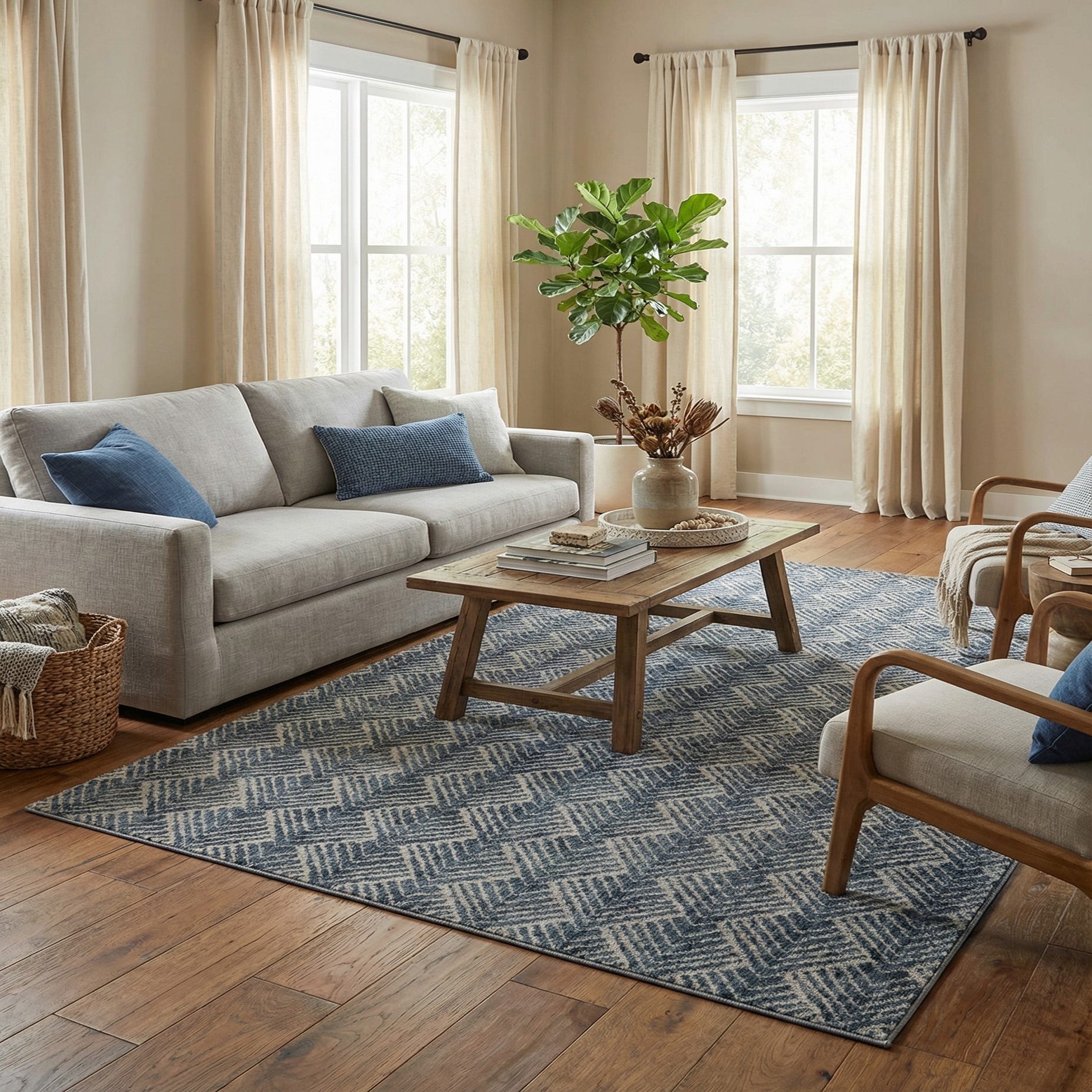 This rug fits well in contemporary and transitional interiors—pair it with light wood furniture and linen upholstery for a coastal or relaxed modern look, or use it to soften clean-lined, mid-century pieces in a living room. It also works nicely under a dining table or at the foot of a bed to anchor a neutral palette; navy, soft grays, and warm metallic accents like brass or aged nickel will complement the harbor blue and ivory tones.