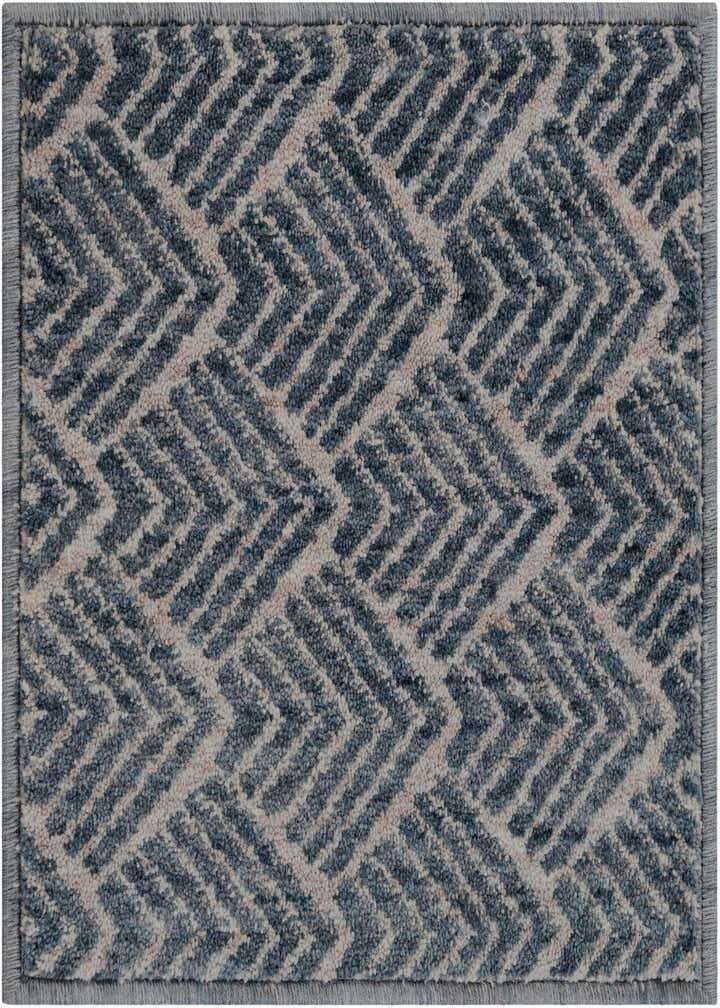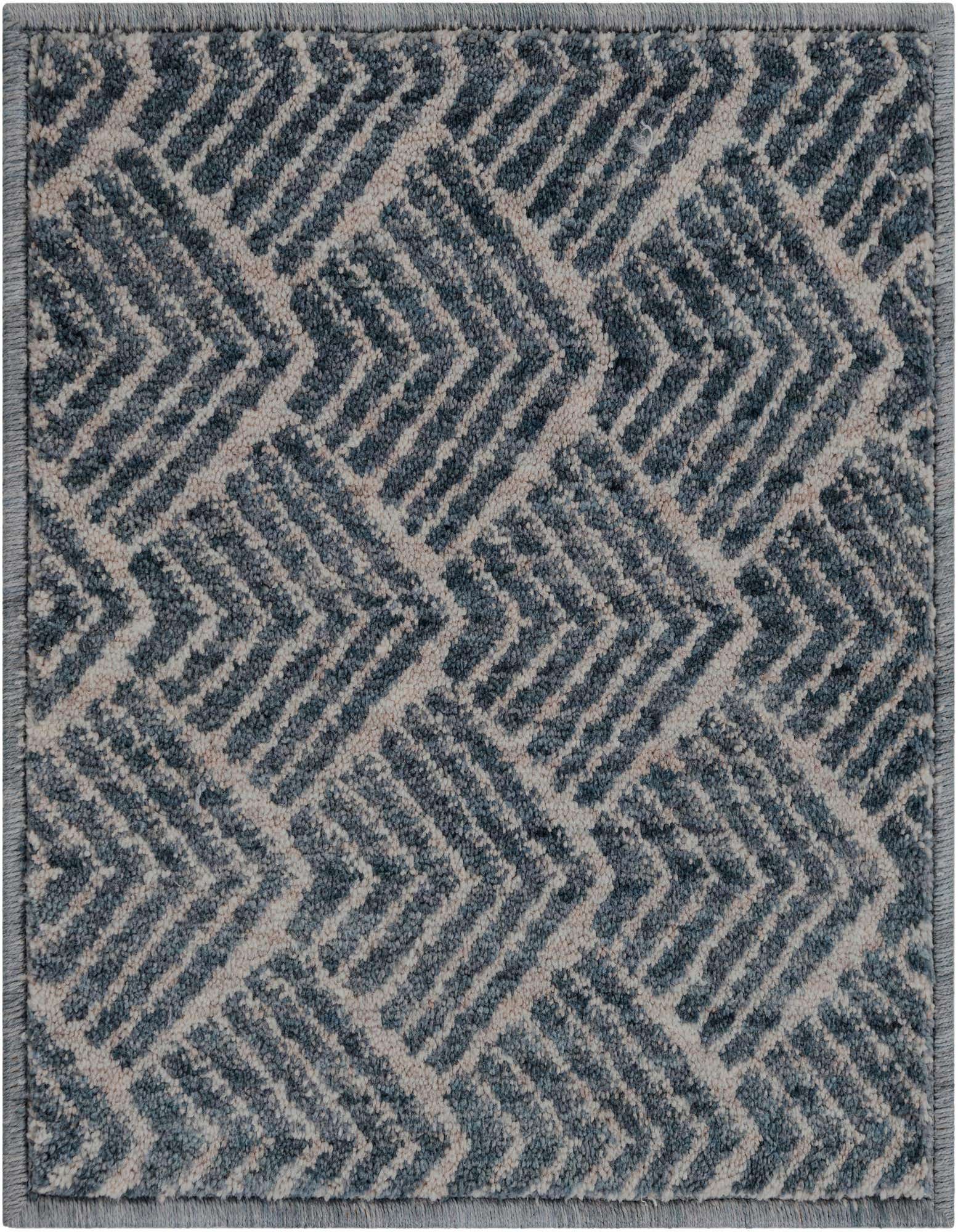 A close-up of a 1' 4 x 1' 4 rectangular rug sample featuring a modern blue trellis pattern on a lighter background.