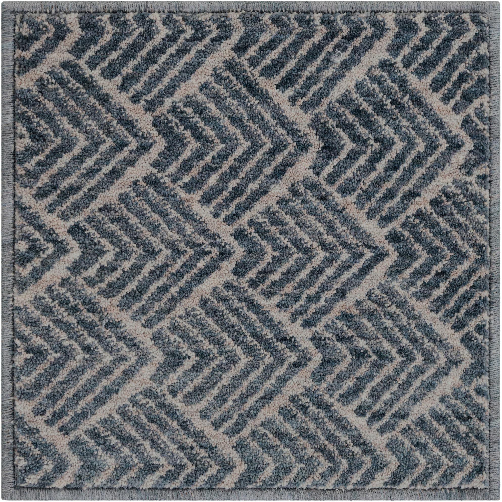 A crisp geometric trellis pattern of staggered chevrons and diamond frames crosses a harbor blue ground, the linear motif worked in ivory to create clear contrast and directional movement. Machine-made from 100% recycled space-dyed polyester, the space-dyeing adds subtle tonal variation to the harbor blue for added depth. The construction has a low-profile pile with a gentle high-low texture you can feel underfoot—the harbor blue stripes lift slightly against the softer ivory base for both visual and tactile interest.