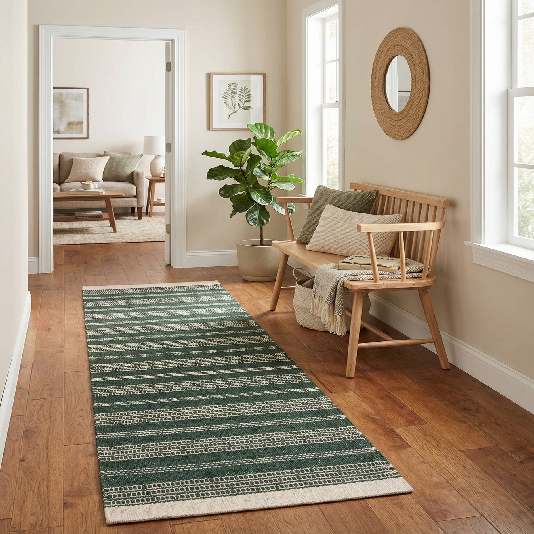 The classic stripe and natural fibers suit a range of interiors, from modern farmhouse and transitional to coastal-inspired spaces. Use it to anchor a hallway or entry, line a kitchen galley, or run alongside a bed to add color and grounding texture. Pair it with warm wood tones, matte metal accents, and simple, neutral upholstery to let the hunter green and ivory pattern stand out without dominating the room.