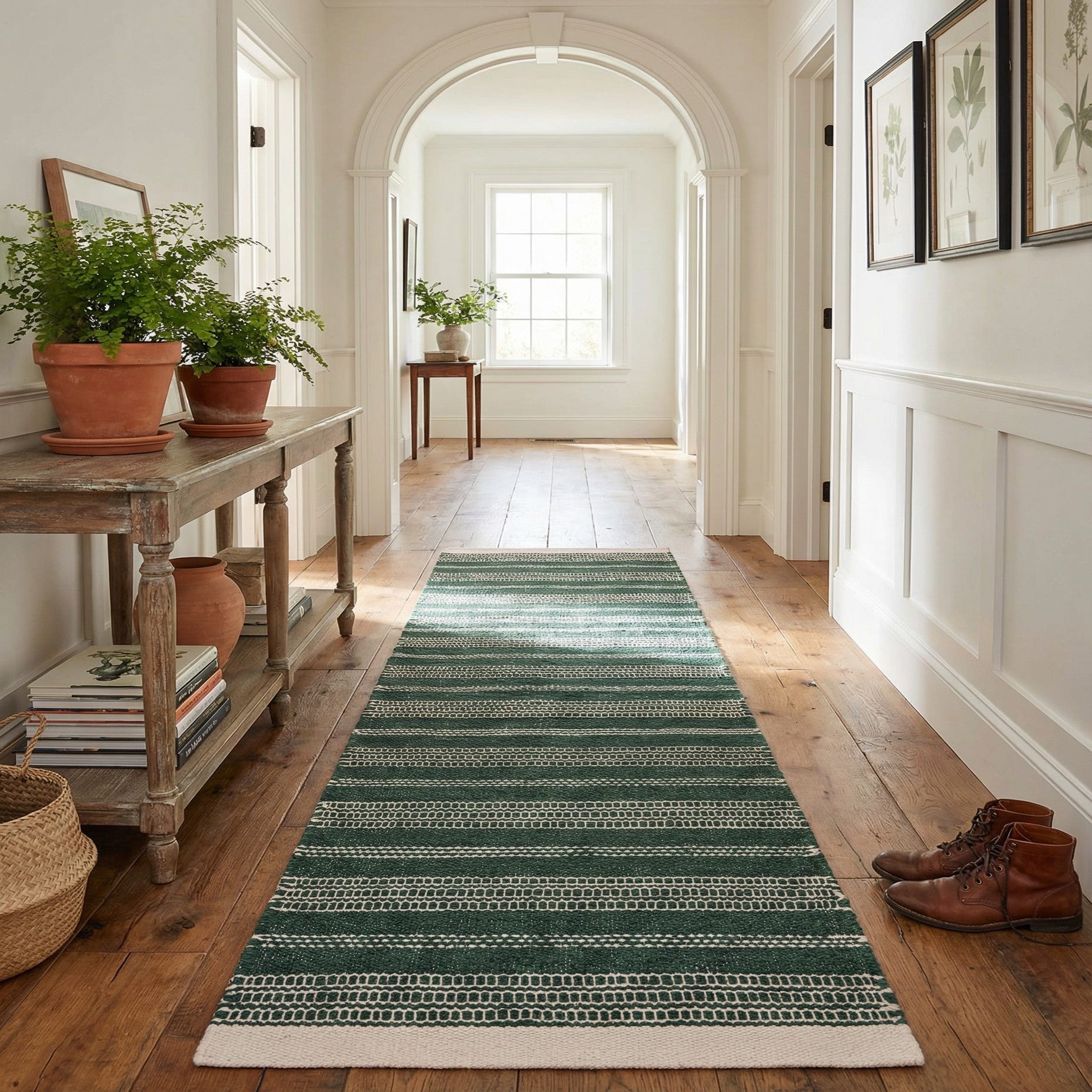 The classic stripe and natural fibers suit a range of interiors, from modern farmhouse and transitional to coastal-inspired spaces. Use it to anchor a hallway or entry, line a kitchen galley, or run alongside a bed to add color and grounding texture. Pair it with warm wood tones, matte metal accents, and simple, neutral upholstery to let the hunter green and ivory pattern stand out without dominating the room.