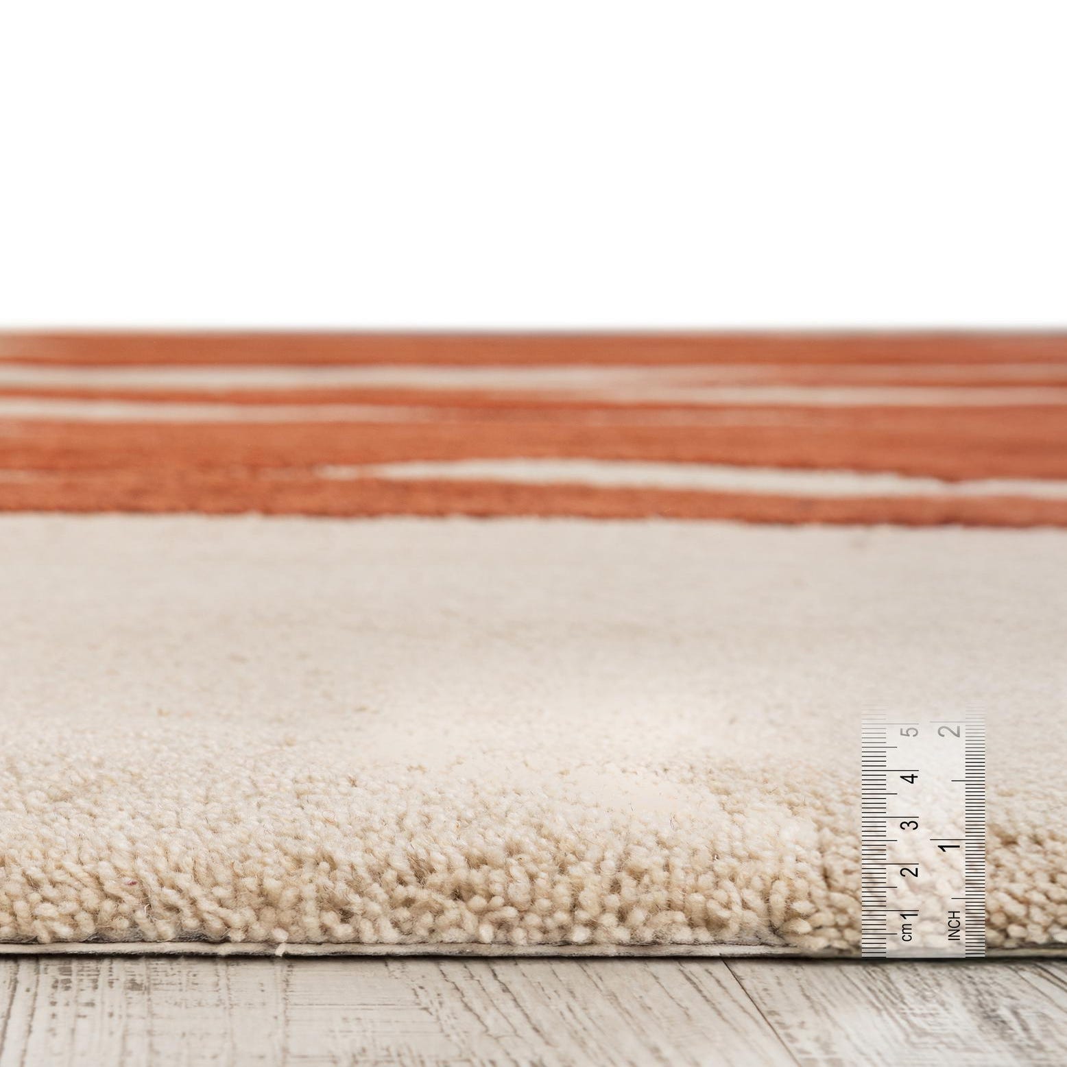 Hand-tufted from 100% wool, the surface has a dense, cushiony pile with the colored bands slightly raised for a subtle sculpted texture you can feel underfoot. The wool construction gives the rug a warm, tactile presence that works well layered or placed on its own. Ideal for an entryway, beside a bed, or in front of a console or sink, it pairs nicely with warm wood tones, leather seating and brass accents, or as a lively accent in a neutral, modern living room or an eclectic, color-forward study.