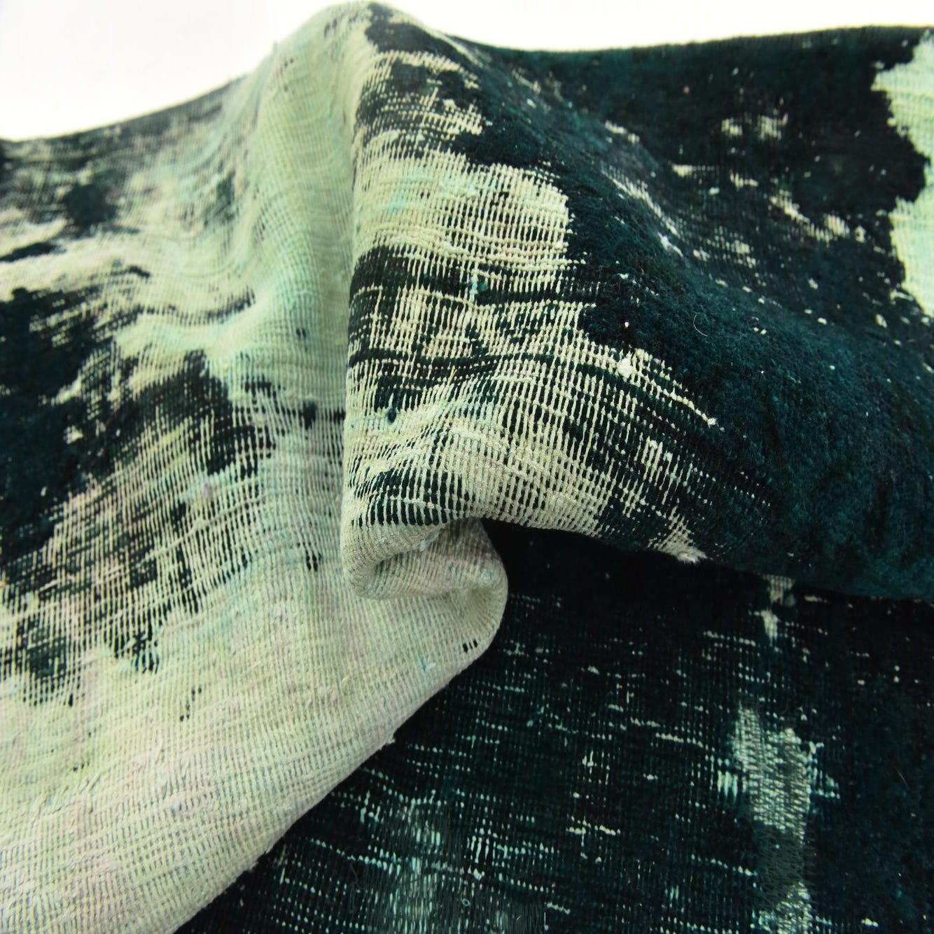 Square green vintage rug with an abstract, distressed pattern of dark teal and light mint green, showcasing a unique blend of modern and traditional styles.