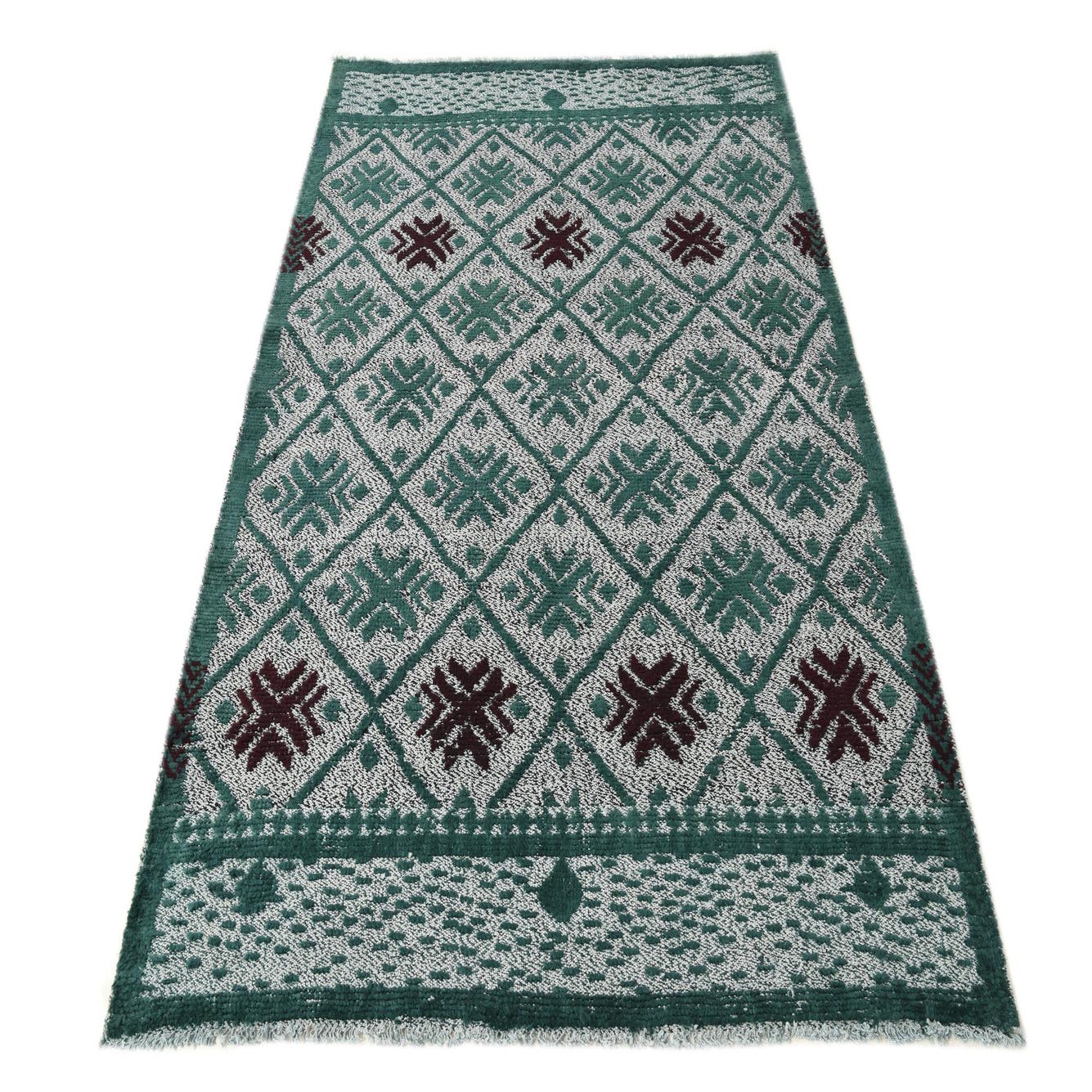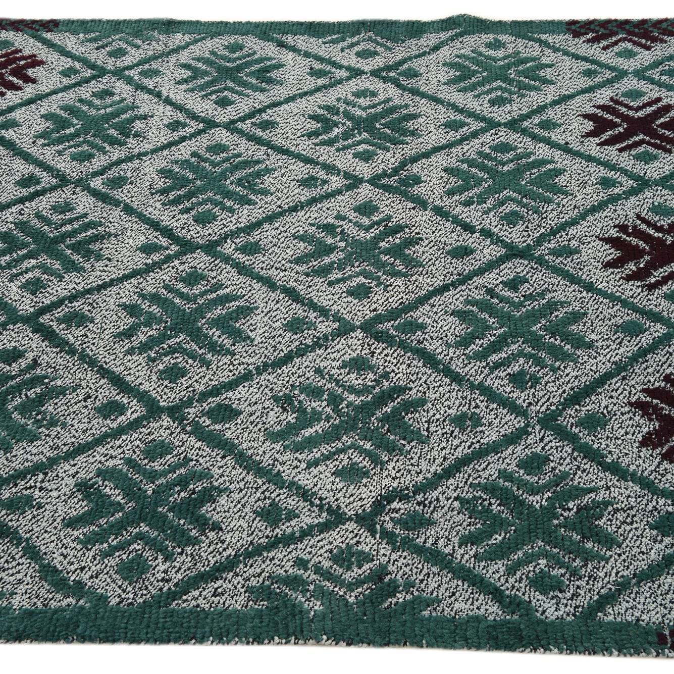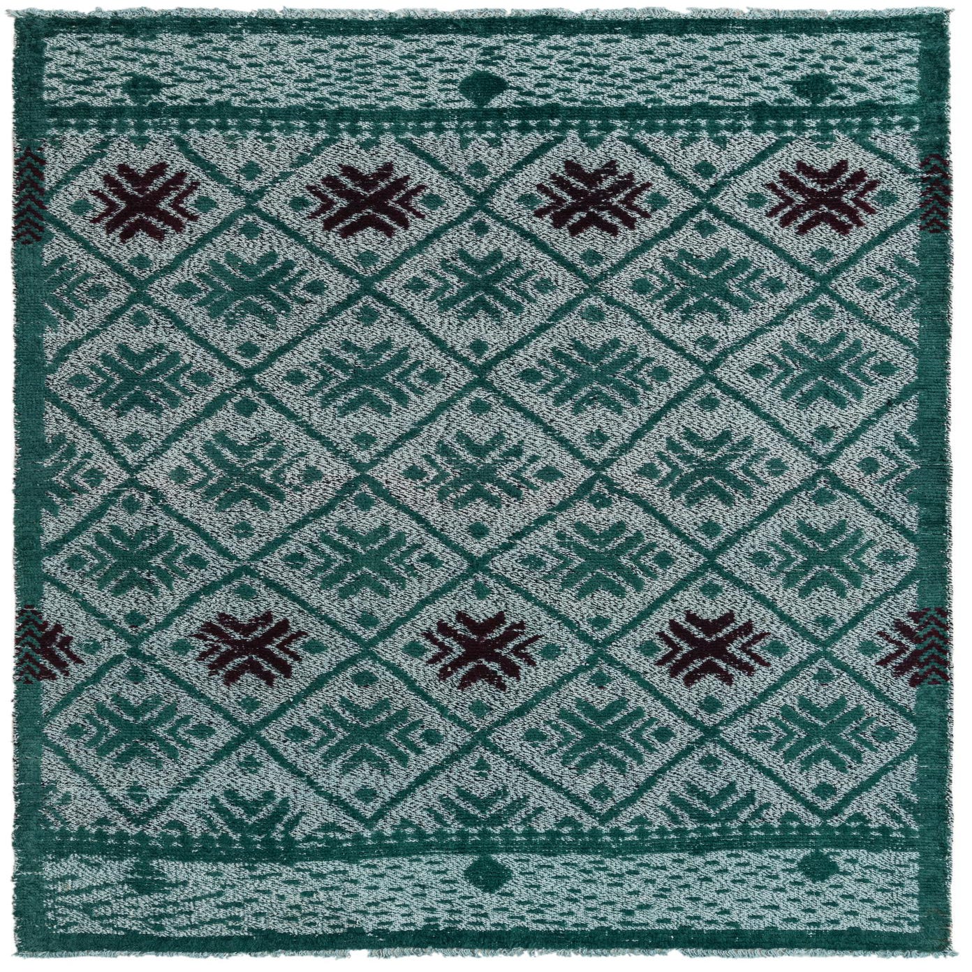 Primary color is Hunter Green. Colors in this rug include: Hunter Green, Burgundy, Light Blue.