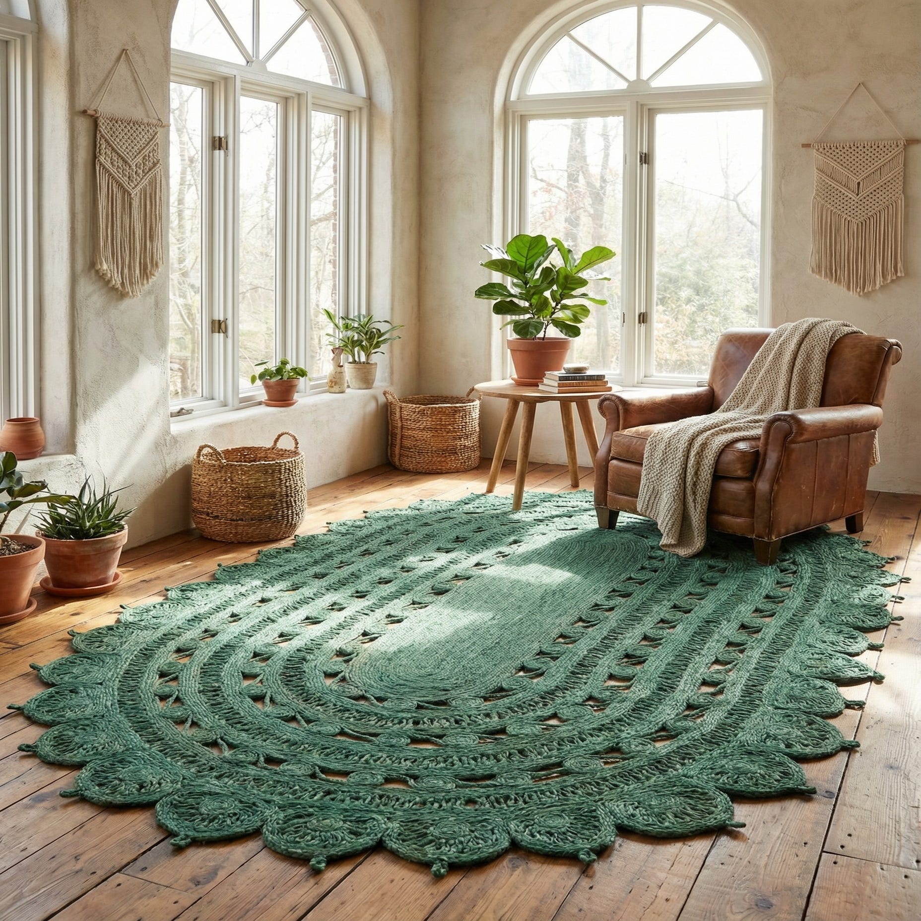 Hand-braided from 100% jute, this oval rug presents a detailed concentric pattern of braided cords, openwork loops and small spiral motifs that create a lacy, layered look. The hunter green color gives the natural jute fibers a rich, grounded tone while the scalloped edge adds a handcrafted silhouette. The surface is tactile and slightly firm underfoot, with the braided texture providing subtle depth and natural variation in each row.