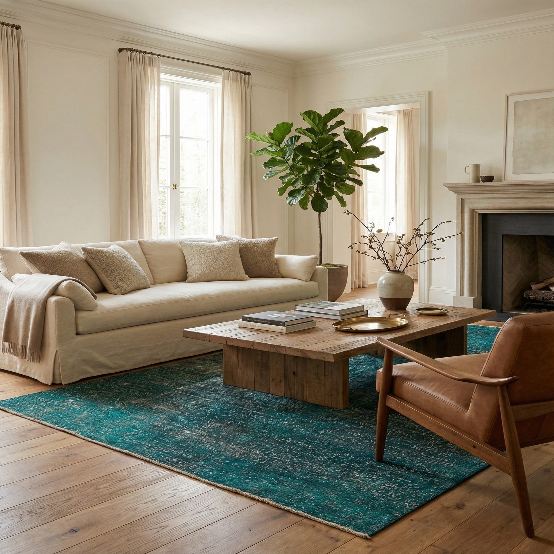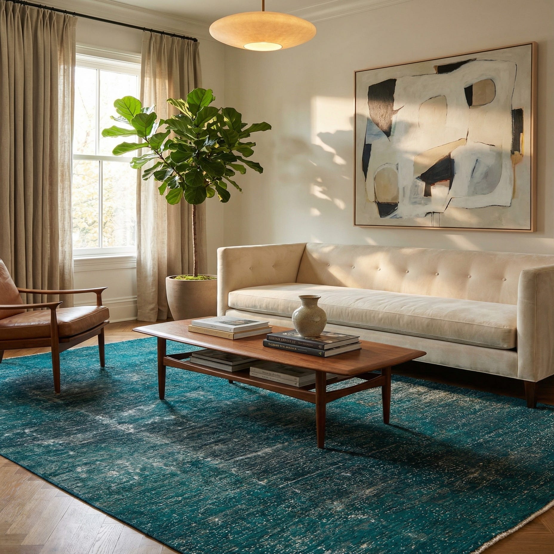Underfoot the wool pile feels soft and substantial, with the hand-knotting giving a slightly slubby texture and gentle irregularities you can feel when you run your hand across it. Use this rug to anchor a living room seating area beneath a low-profile sofa and coffee table, to add mood and warmth to a bedroom, or to ground a home office with dark wood furniture and brass accents. It pairs especially well with leather sofas, mid-century wood pieces, neutral linens, and teal or ivory accent textiles for a balanced, layered look.