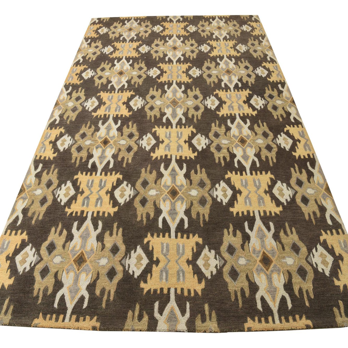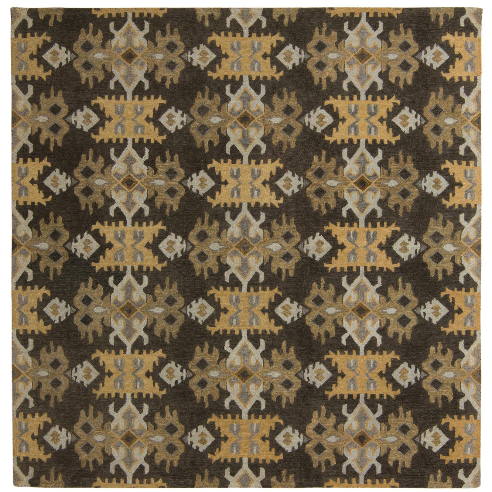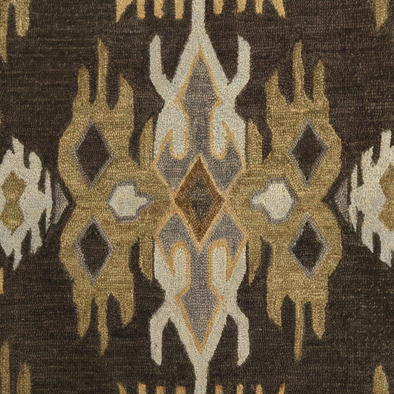 The symmetrical arrangement of the pattern lends a sense of order and sophistication, while the contrasting hues add depth and visual interest to the design. It's well-suited for a variety of interior styles such as modern, transitional, or eclectic settings. This rug would complement a space with rich wood tones, neutral furnishings, and could serve as a focal point in a minimally decorated room or as a complementary piece amidst bolder decor elements. The wool-cotton blend not only enhances the textural appeal but also brings warmth and comfort to living areas, dining rooms, or larger bedrooms.