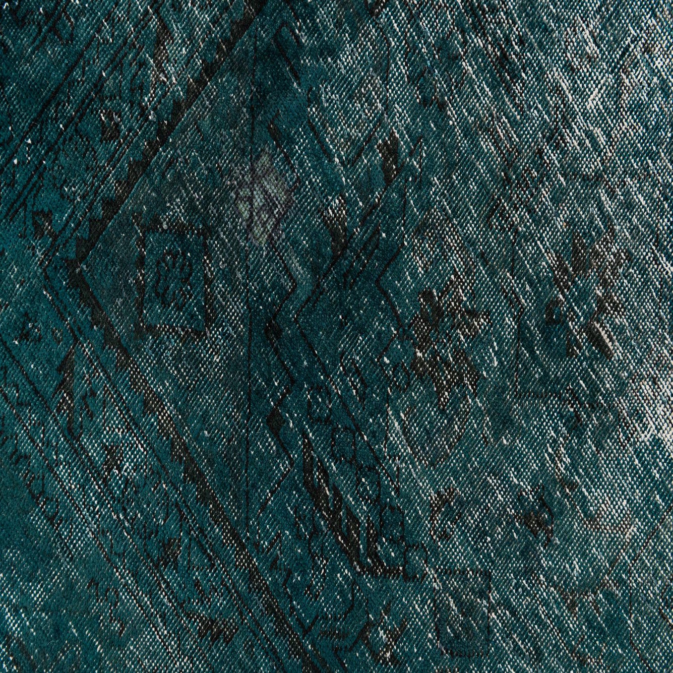 Hand-knotted from 100% wool, this rug presents a deep hunter green field softened by distressed black and ivory accents. The pattern is low-contrast and intentionally aged: a quietly worn central field with faint medallion traces and a subtle linear border that add depth without dominating the room. The surface feels dense and softly textured beneath your hand—a low, even pile with slight variation from the hand-knotting that gives the rug a lived-in, tactile quality.