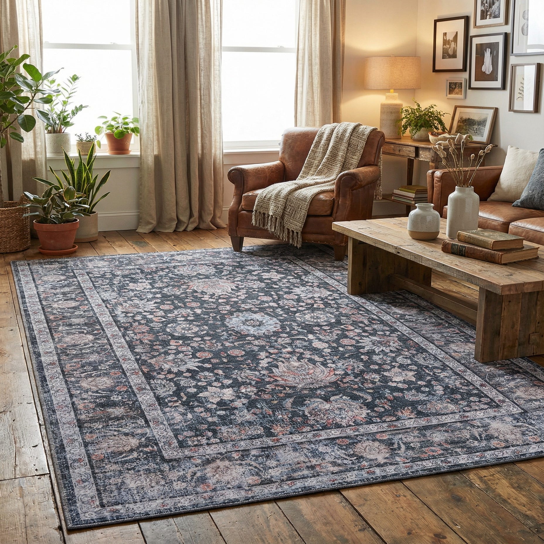 Machine-made from polyester and chenille, the surface has a soft, velvety hand and a low-to-medium profile that still captures intricate patterning. Its dark ground and rich accent colors make it ideal for anchoring a living room seating group or adding depth beneath a dining table, and it pairs easily with warm wood furnishings, brass or matte-black metal accents, and neutral upholstery. The rug also fits well in a cozy bedroom or a study where classic motifs meet modern finishes.
