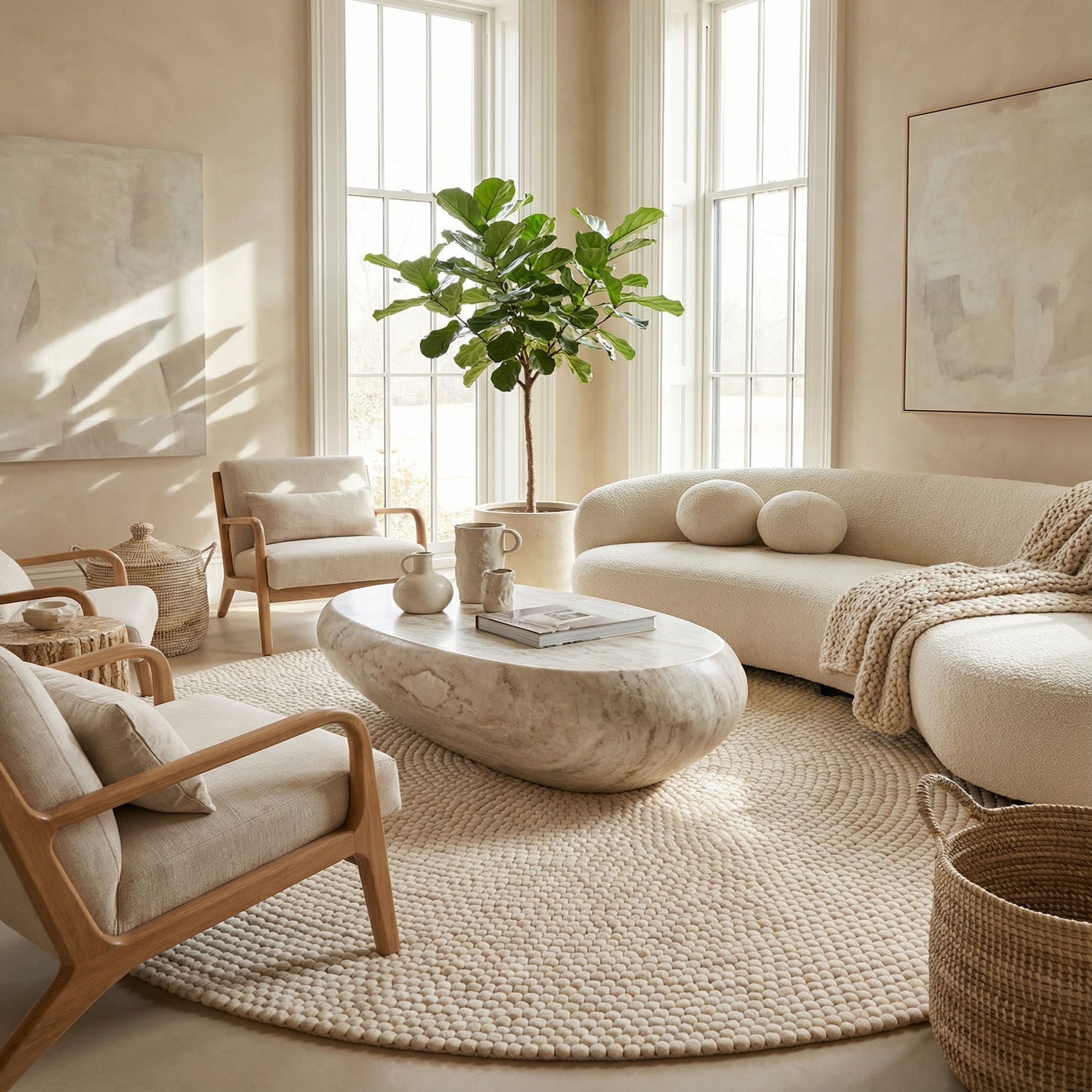 This rug pairs naturally with light wood furniture, linen upholstery, and muted metal accents for a calm, modern aesthetic. It works well beneath a round dining table to define a seating area, layered under a low-profile sofa to add tactile warmth, or placed in a nursery or bedroom for a soft, inviting surface. The neutral color and handcrafted texture make it an easy anchor for Scandinavian, contemporary farmhouse, or casual coastal interiors.