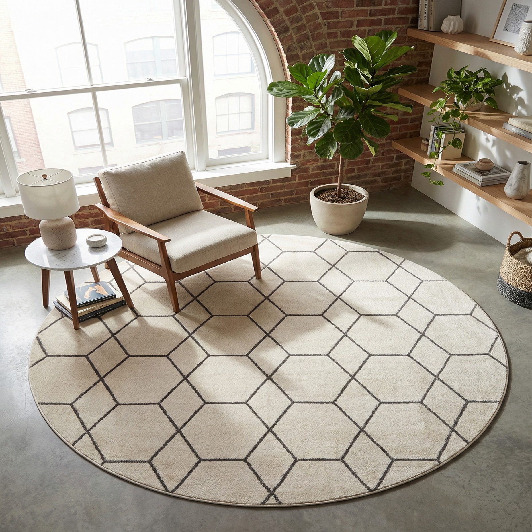 This round design works well as a focal anchor under a circular dining table or to define a cozy seating area with a round coffee table. It complements contemporary, Scandinavian, and transitional interiors and pairs nicely with natural wood finishes, matte black metal accents, and neutral upholstery. Use it in a living room, bedroom, or nursery to introduce pattern and subtle texture while keeping the palette light and versatile.
