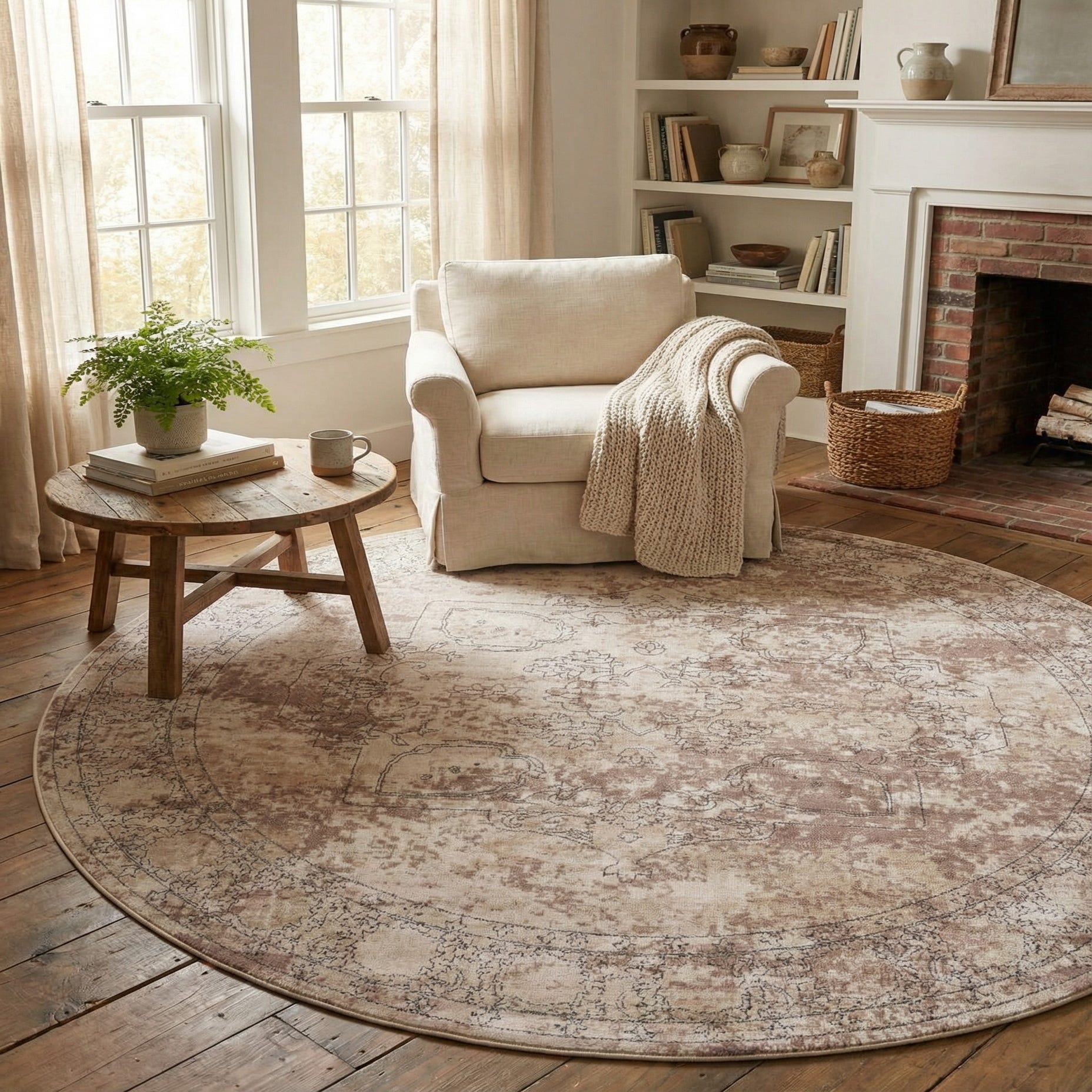 Machine made from 85% polypropylene and 15% polyester, the rug has a low, dense pile that feels smooth underfoot with a slight velvety touch. Its neutral tones and understated ornamentation make it well suited for transitional, coastal, or modern farmhouse interiors. Use it beneath a round dining table to ground the space, place it under a circular seating arrangement in a living room, or layer it in a bedroom beneath the bed to add warmth and visual interest. Pair with natural wood furniture and soft linens for a relaxed look, or add black metal accents and textured throws for a contemporary contrast.