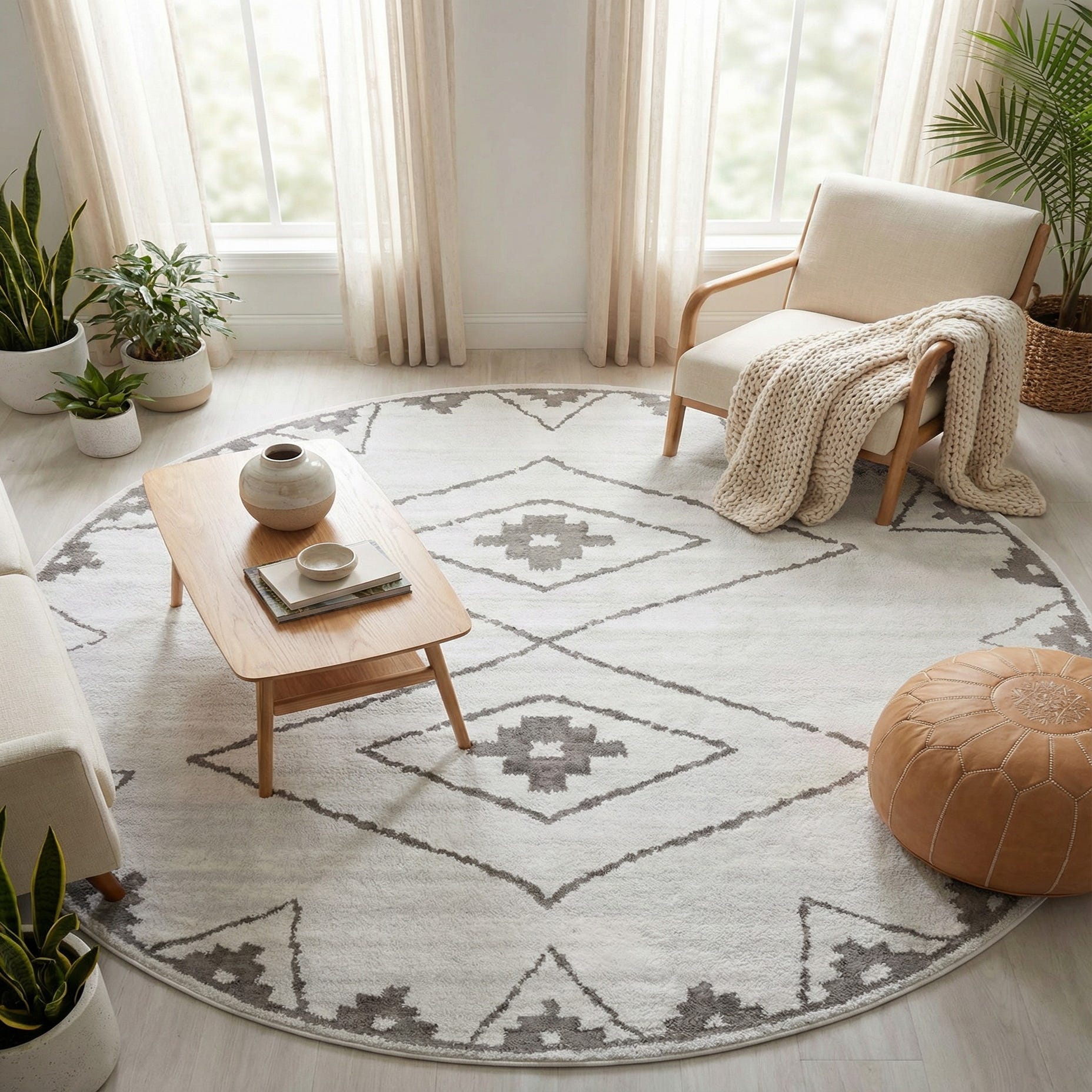 This round rug works well in minimal, Scandinavian, or modern farmhouse settings where a neutral foundation is needed. Place it beneath a round dining table, as an anchor for a cozy seating area, or at the foot of a bed to soften hardwood floors. Pair with light wood furniture, linen upholstery, and touches of woven textures or matte metal to emphasize the rug’s calm colorway and understated pattern.