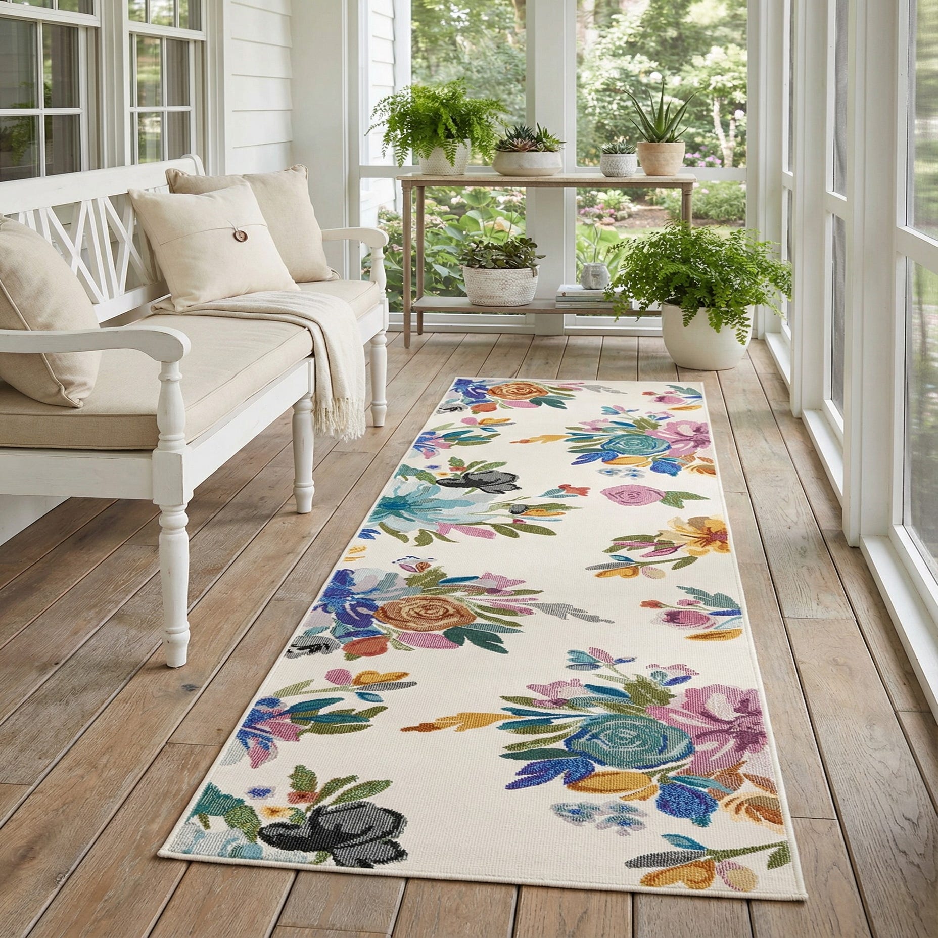 Woven from 100% polypropylene, the rug has a low-profile, tightly constructed pile with a subtle texture you can feel underhand and underfoot. The surface reads smooth but tactile, giving the floral motifs a crisp, woven definition. Use this runner to enliven a hallway or entry, anchor a narrow kitchen aisle, or add a cheery path beside a bed. It pairs nicely with light-colored walls and natural wood tones, and it complements both relaxed cottage or farmhouse settings and more eclectic, modern interiors that welcome bold color accents.