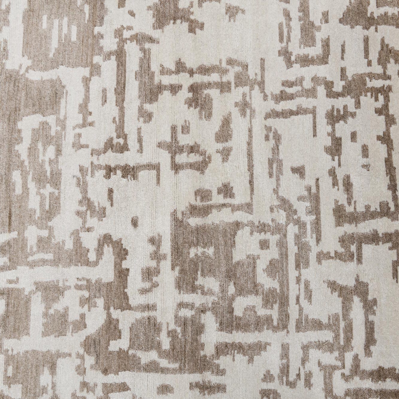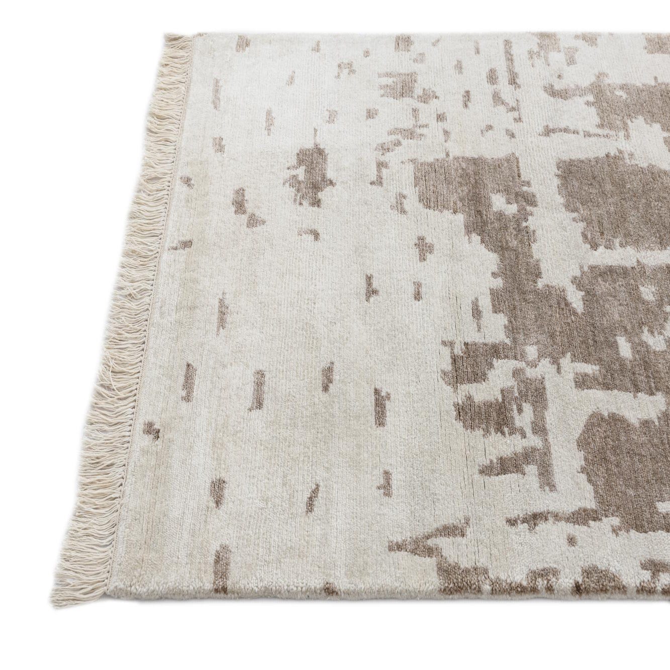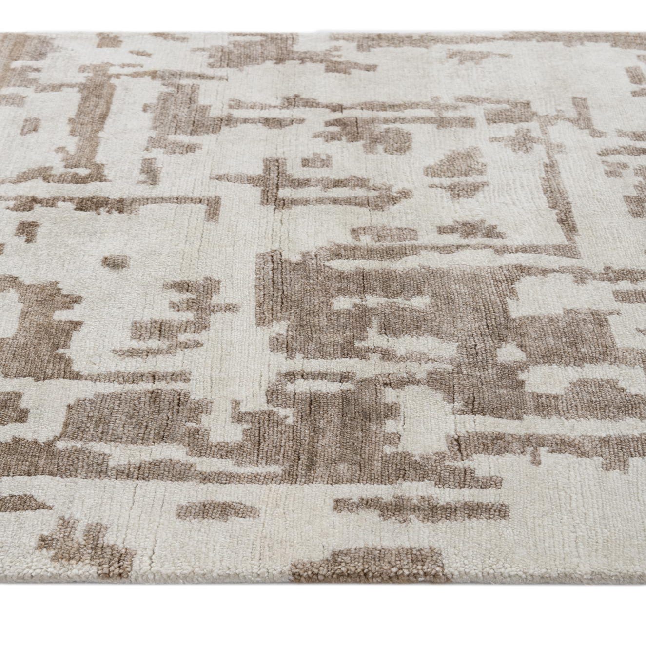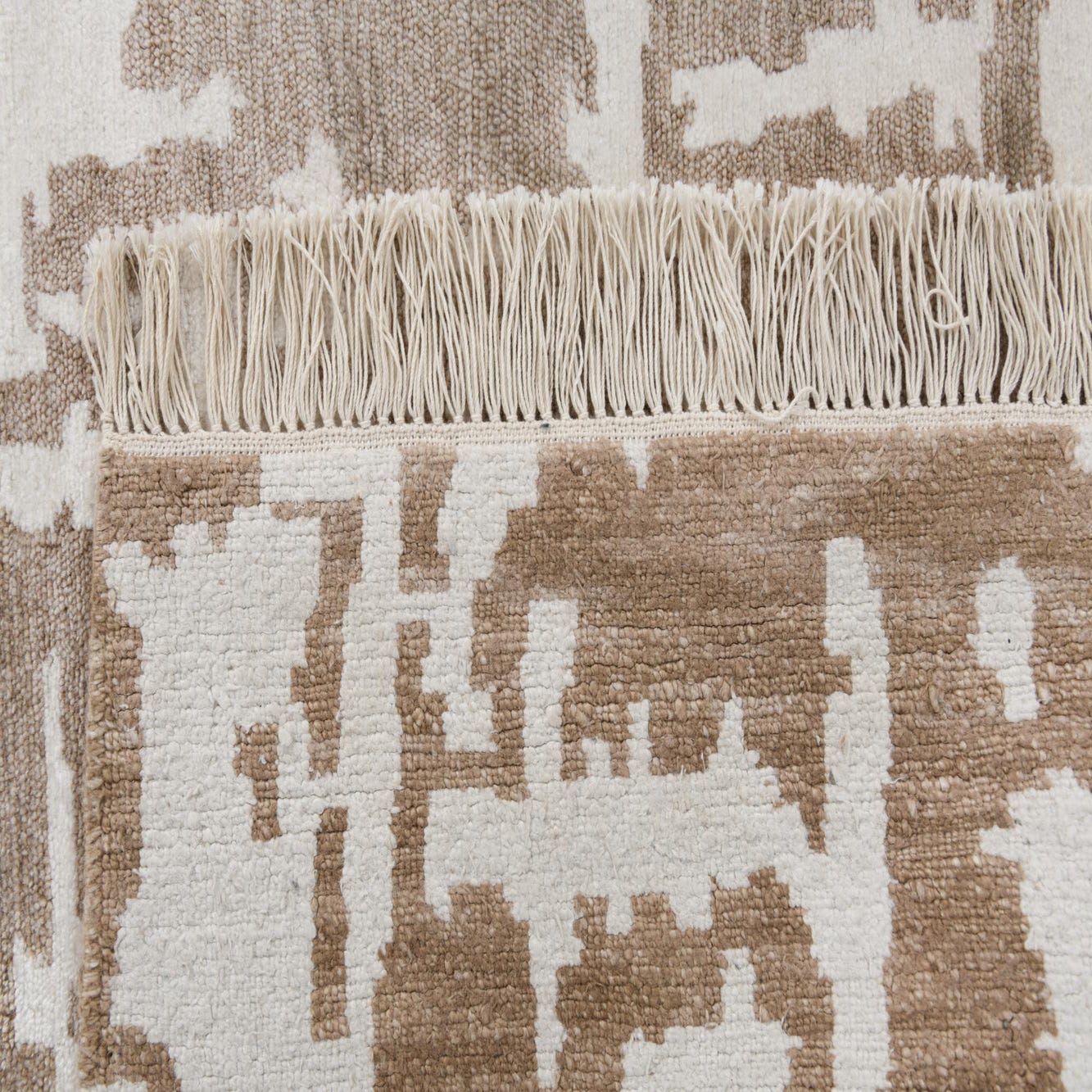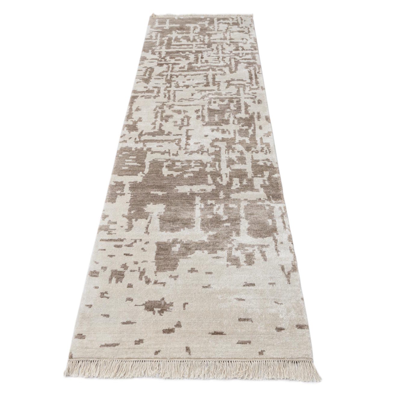 The Darya collection presents a sophisticated 10-foot runner that is hand-knotted from 100% wool, offering both durability and tactile comfort. The rug features an abstract pattern with a deliberate use of light brown and beige tones on an ivory background, creating a neutral palette that can integrate seamlessly into a variety of interior designs.