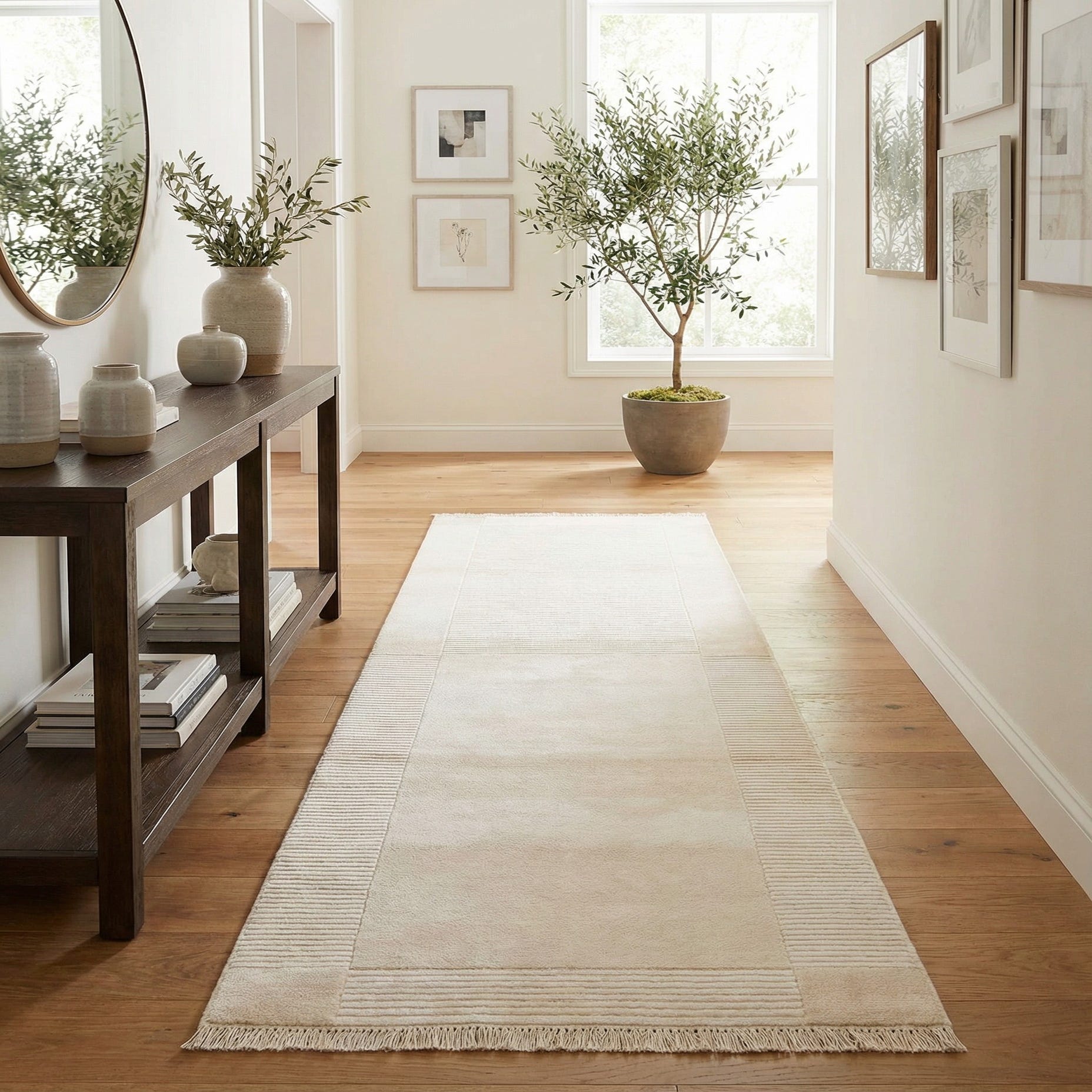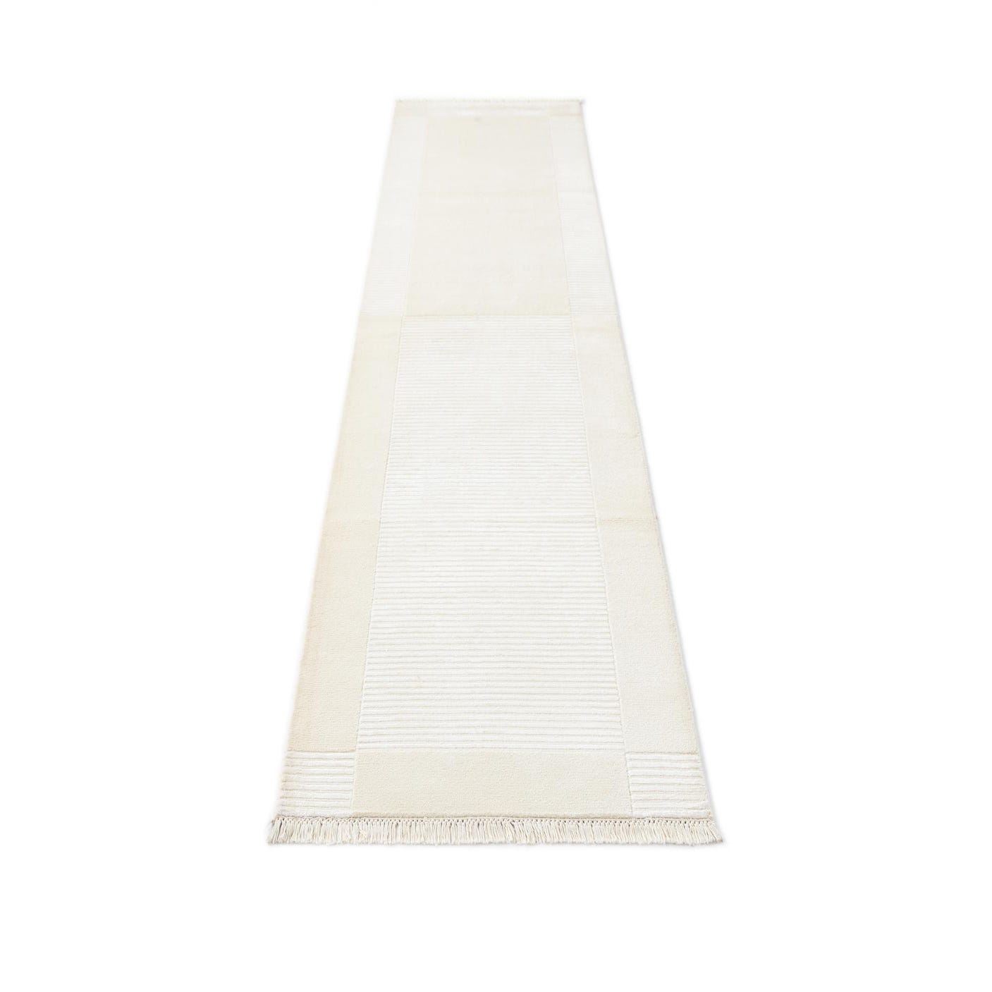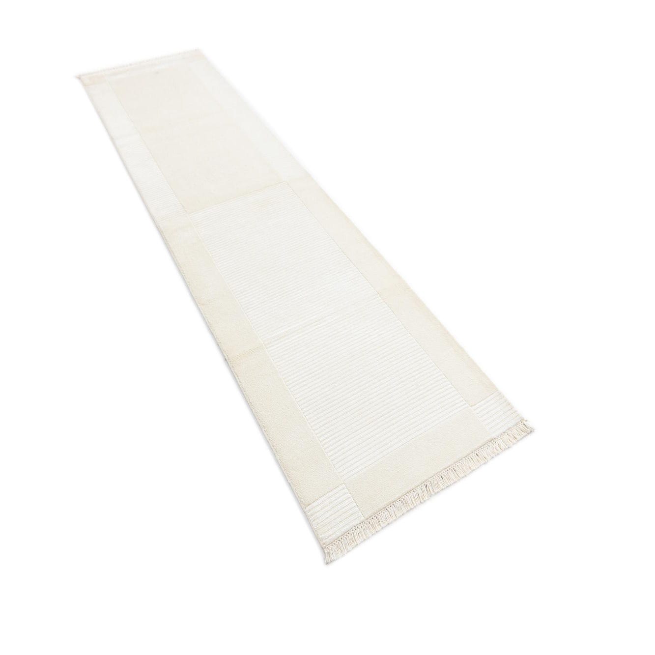 A 10 ft Darya runner rug in ivory and cream, featuring a modern striped pattern and fringe ends, ideal for a hallway.