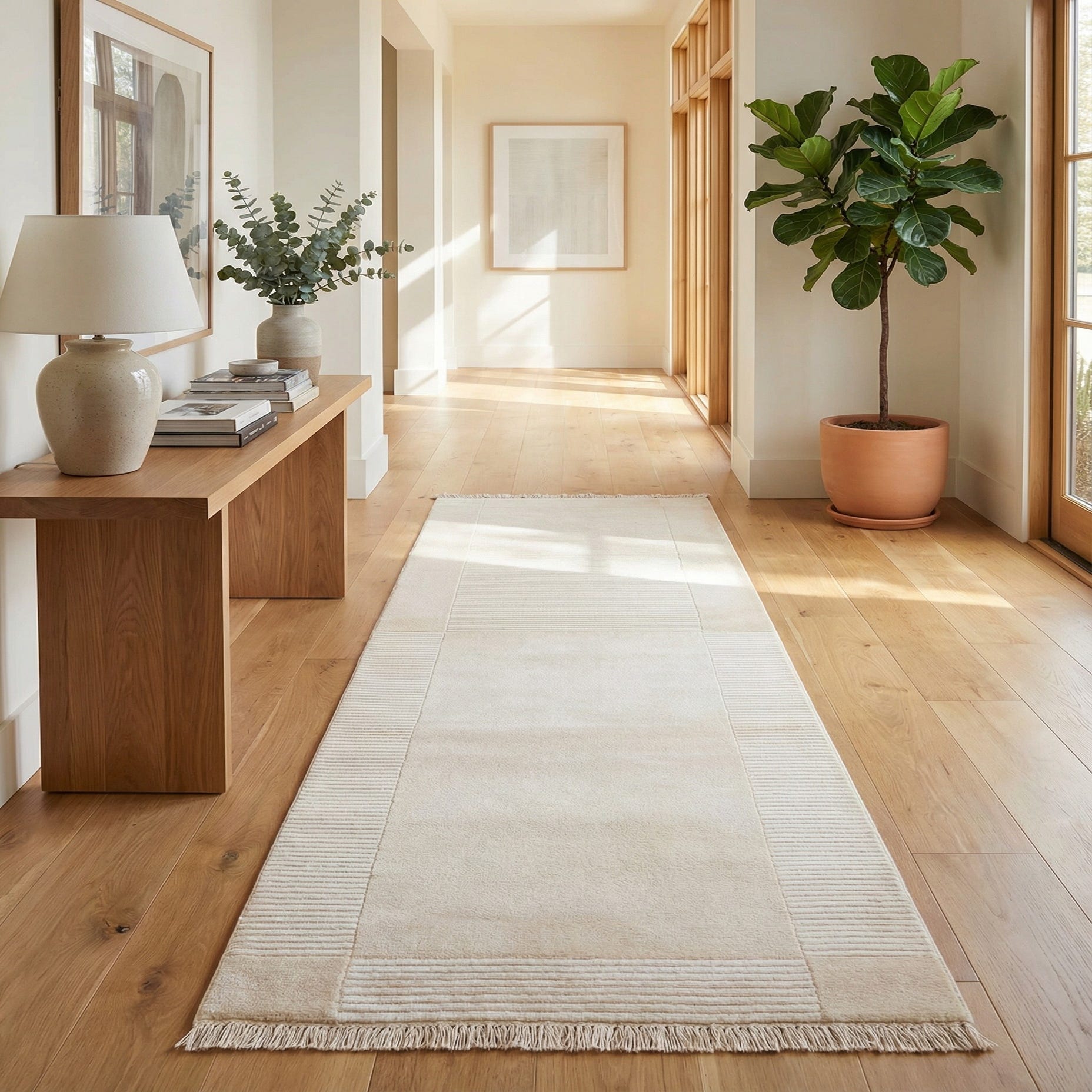 This runner works well in modern, Scandinavian, or transitional interiors that favor light, airy palettes. Place it in an entry hall or narrow corridor to brighten and unify the space, alongside warm wood floors and neutral upholstery, or layer it over a larger area rug for added depth in an open-plan living area. It also complements coastal and minimalist schemes when paired with natural linens, matte metals, and simple, clean-lined furniture.