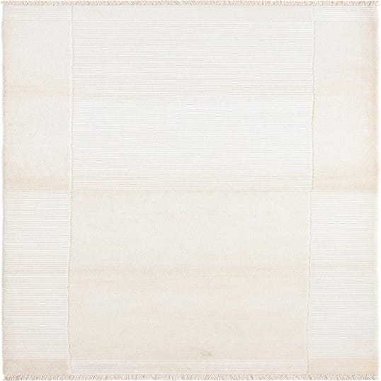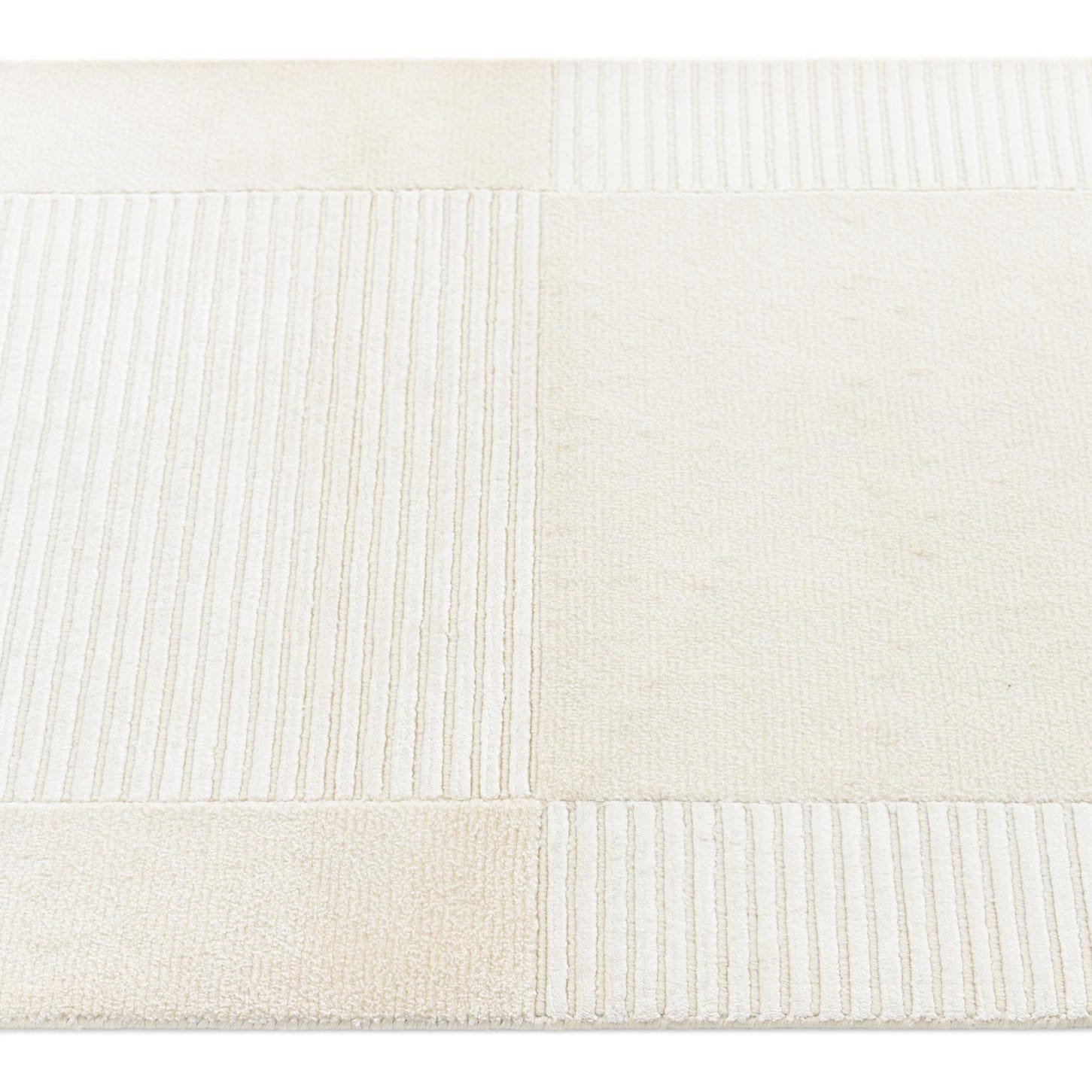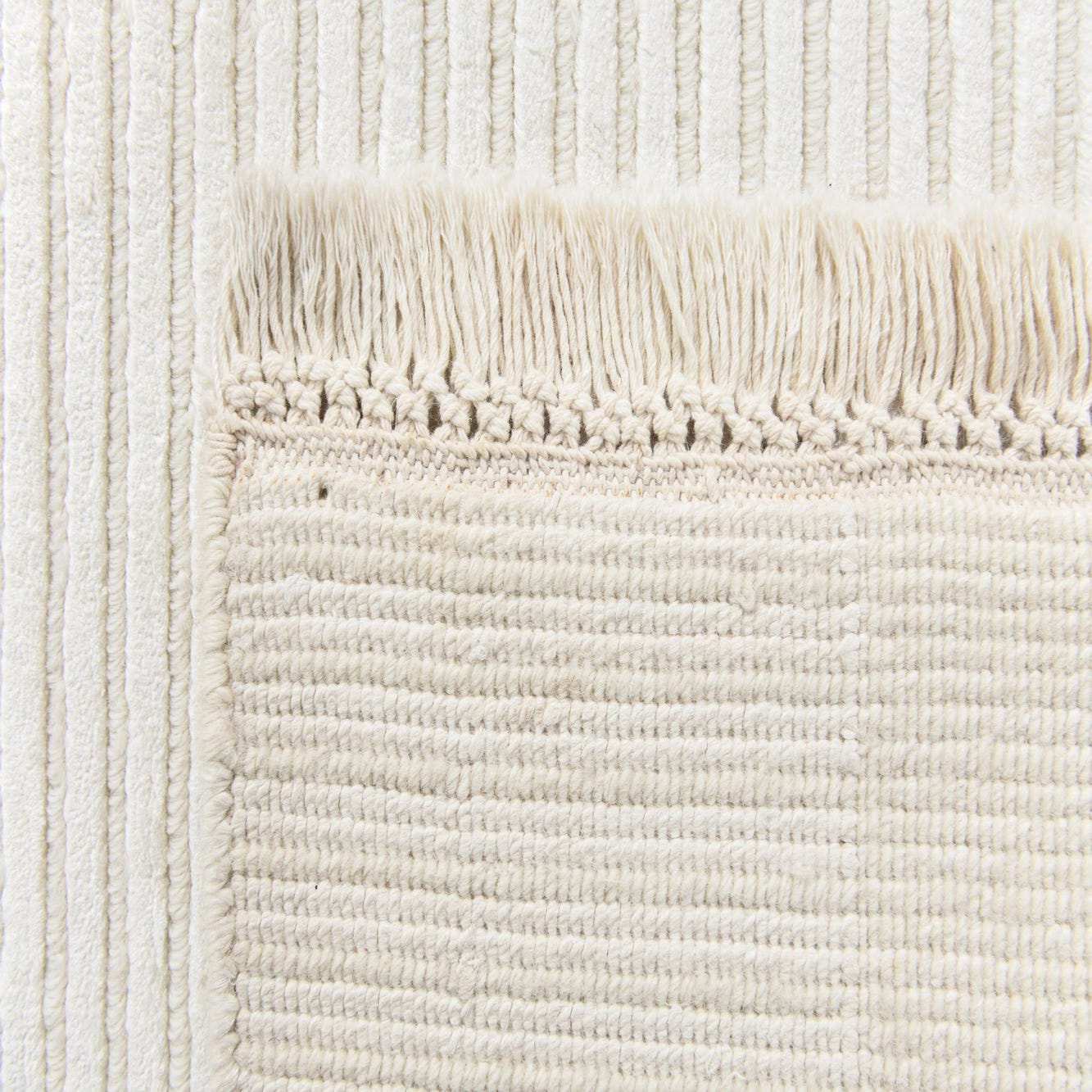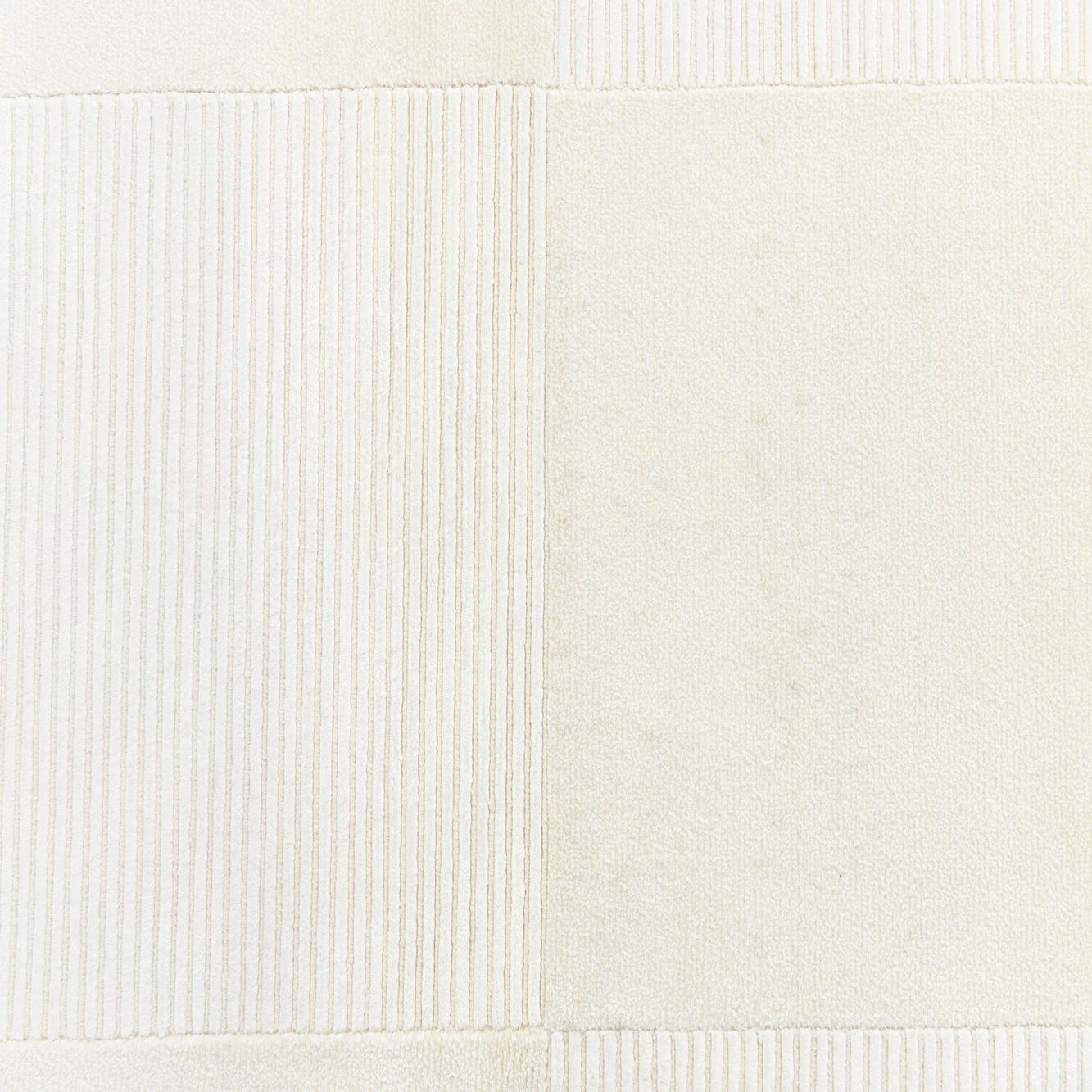 A clean, tonal runner with a quiet geometric layout, this hand-knotted 100% wool piece pairs a wide, ivory field with subtle ribbed bands and rectangular panels for low-contrast definition. The repeating horizontal ribs in the center and at the ends create gentle linear movement across the length, while the flat ivory border and short fringed ends add a handcrafted finishing touch. The wool pile reads soft and low-profile, with the ribbed sections offering a slightly raised texture you can feel underfoot.