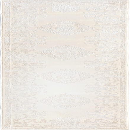 A tonal medallion-and-scroll design rests on an ivory field, with repeating oval medallions and an ornate scroll border worked in low-relief. The pattern is classic and refined, rendered in a soft, slightly lustrous pile that catches light differently across the design so the motifs are visible more by texture than contrast. Machine-made construction of 60% polypropylene and 40% polyester gives the surface a plush hand with a subtle sheen and a low-profile feel underfoot.
