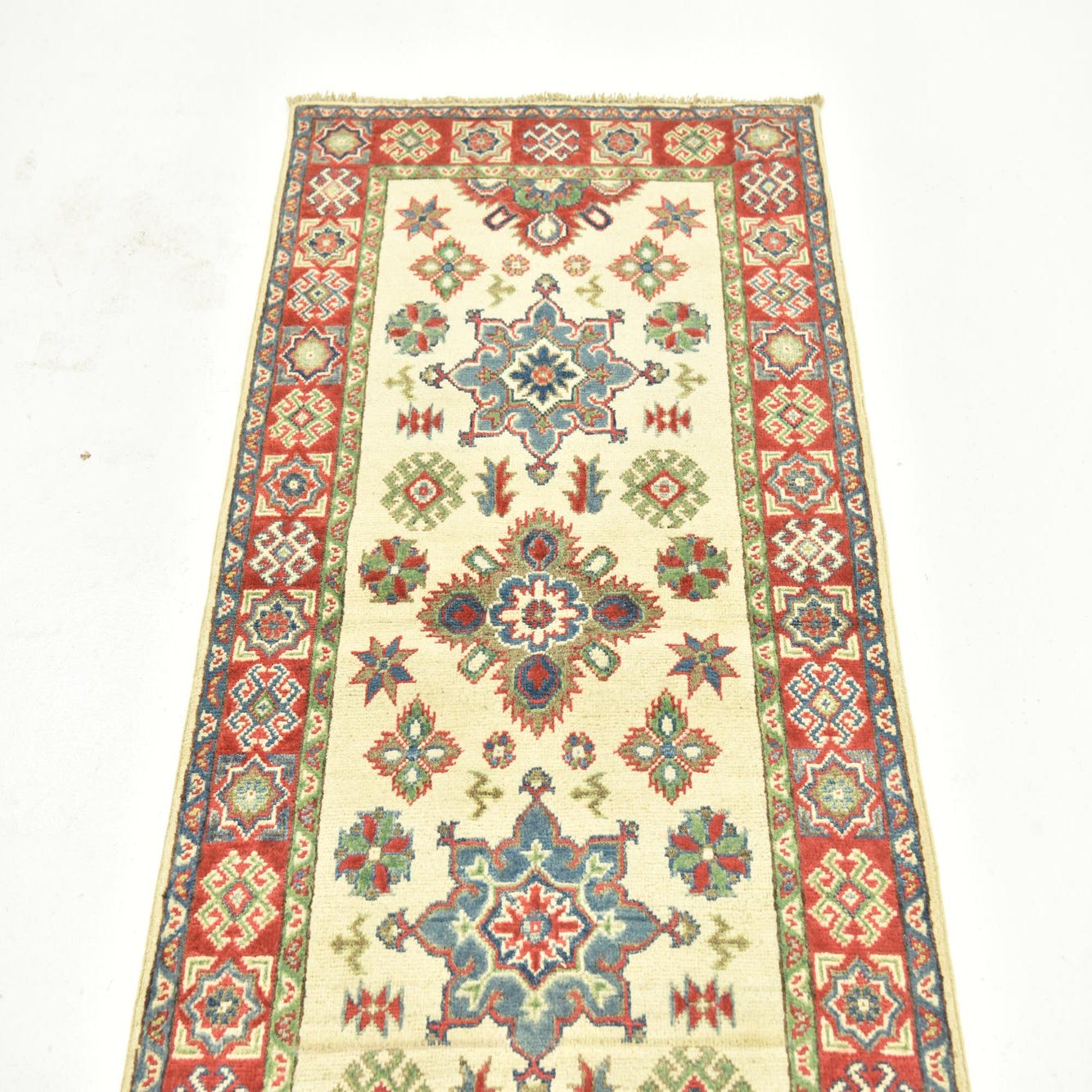 A 10 ft runner rug with an ivory center and traditional tribal patterns in red, blue, and green, perfect for a hallway.