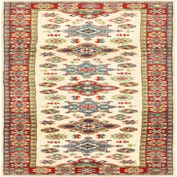 Primary color is Ivory. Colors in this rug include: Ivory, Beige, Blue, Navy Blue, Red, Green.