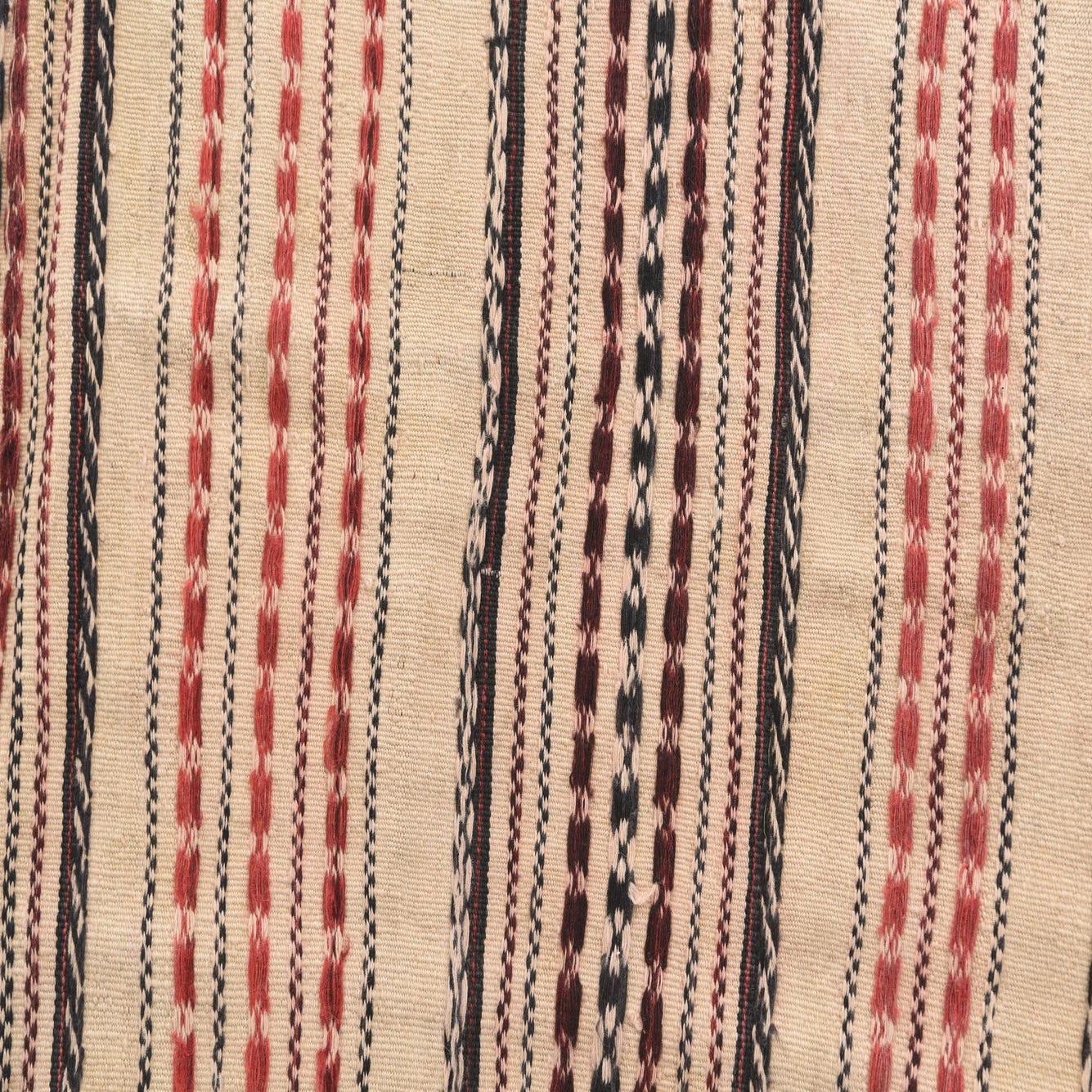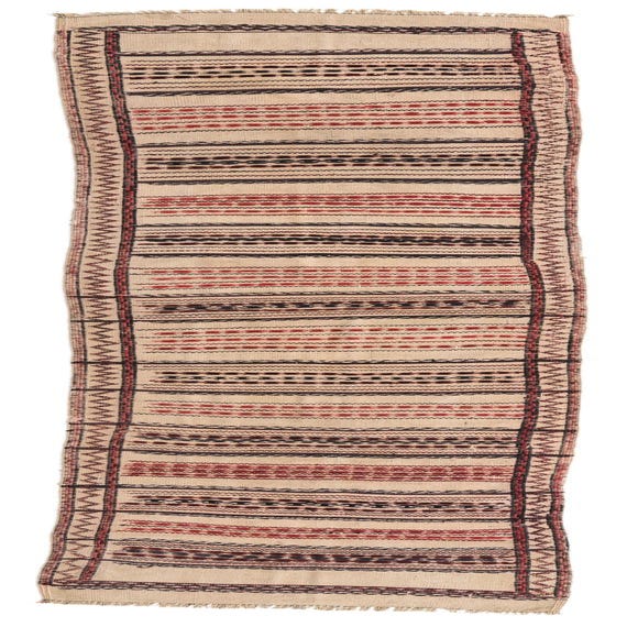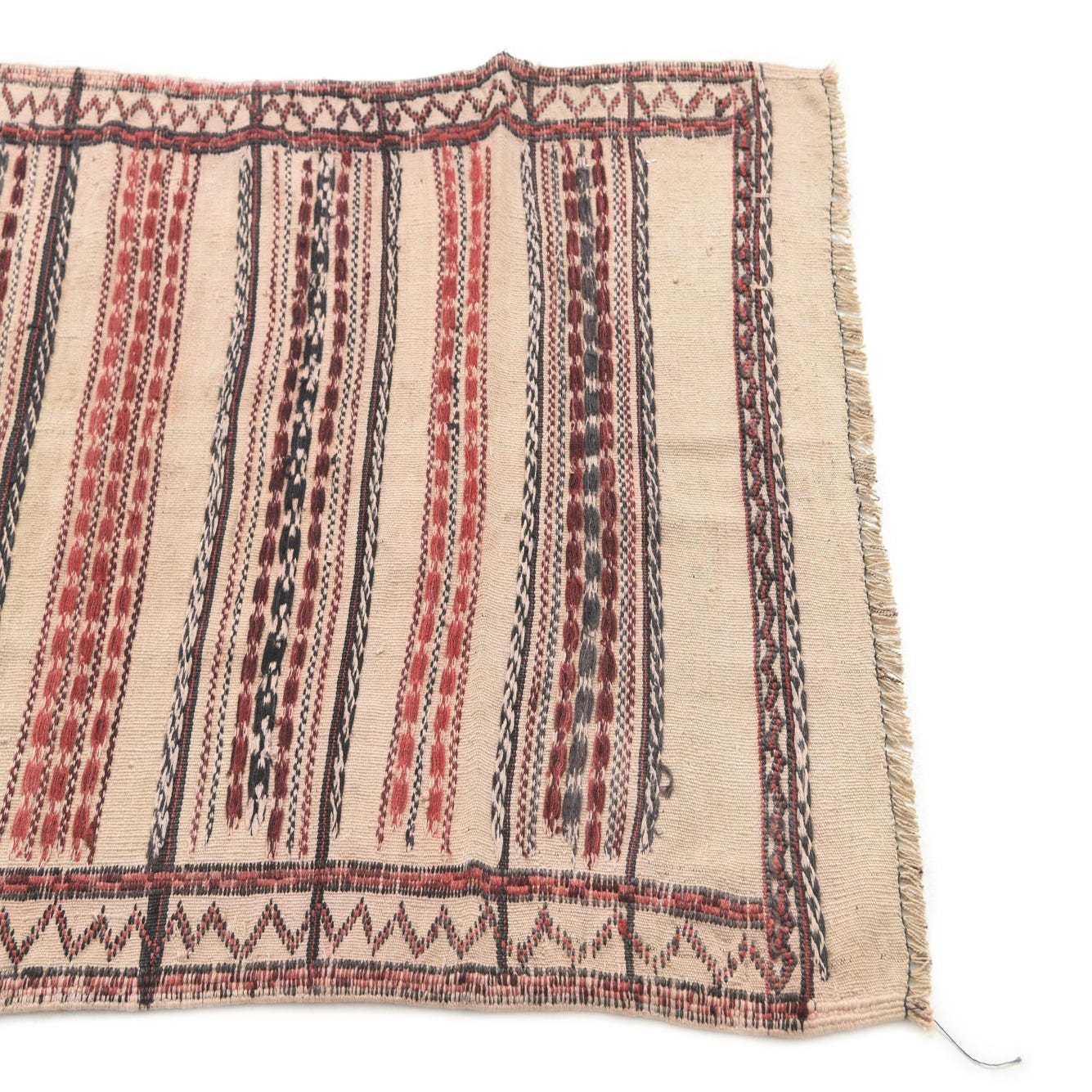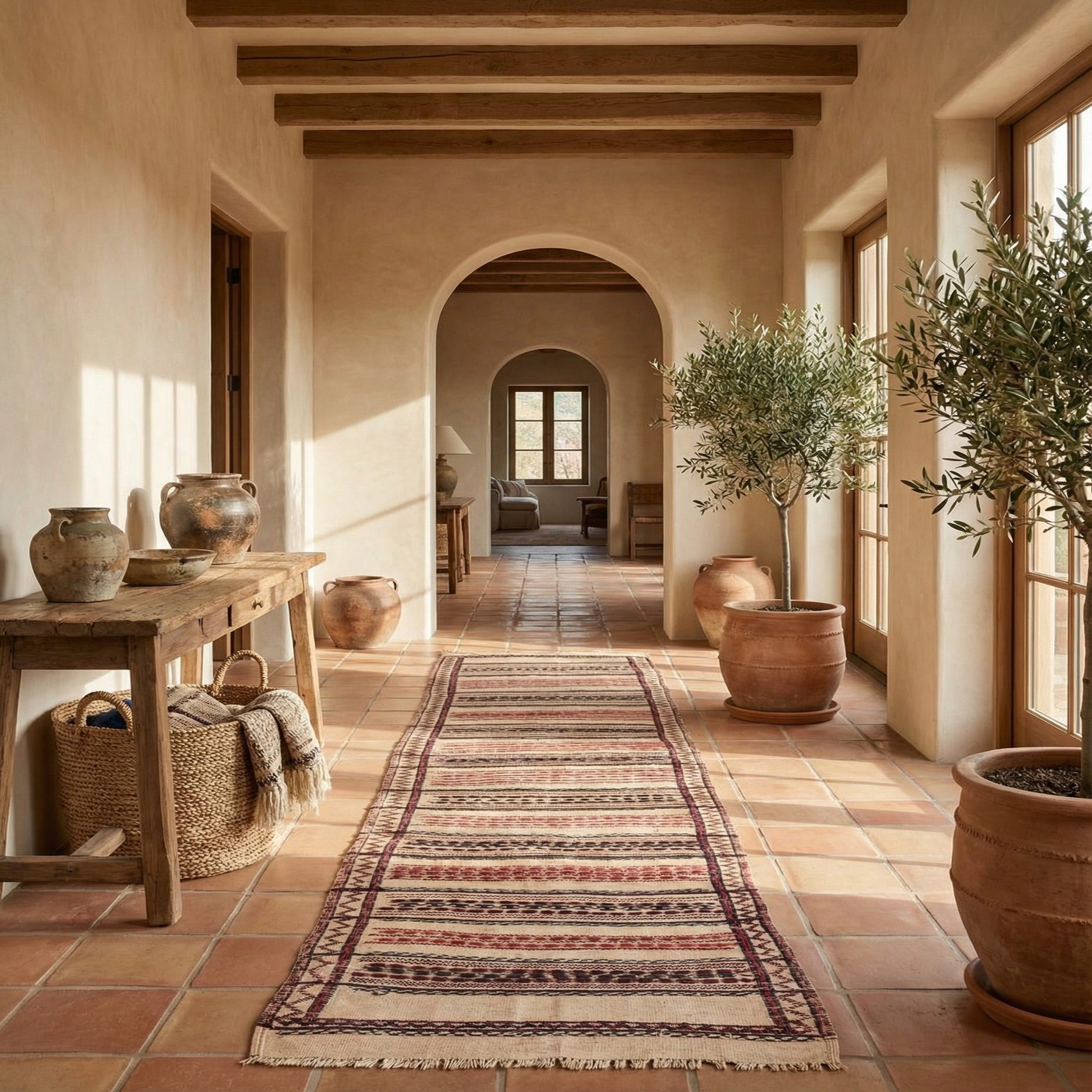 A 10 ft Kilim Fars runner rug with ivory background and tribal red and black striped patterns, ideal for a hallway.