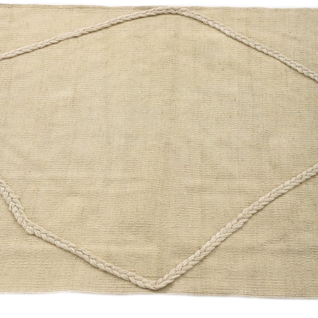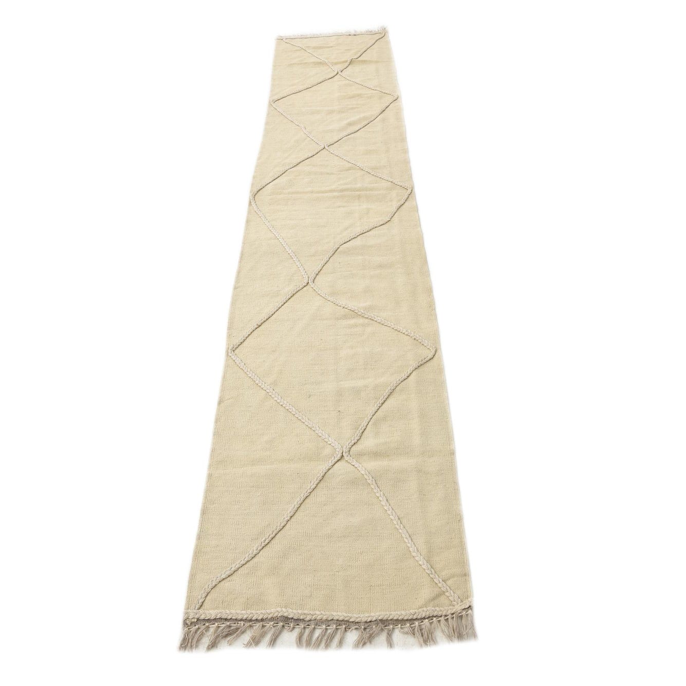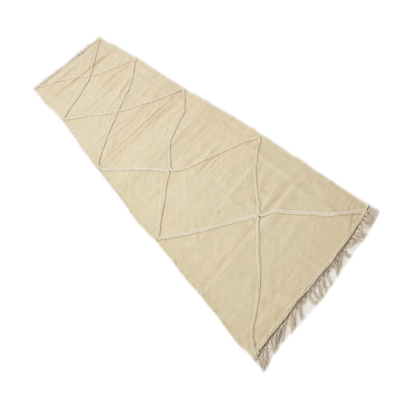 Hand-woven from 100% wool, this ivory runner pairs a smooth, flatwoven field with a raised braided diamond lattice that you can both see and feel. The monochromatic palette keeps the look calm while the hand-twisted cords add subtle depth and texture; short fringed ends reinforce the handcrafted character. The geometric pattern is clean and modern, with a gentle organic irregularity that gives the piece personality without dominating a room.