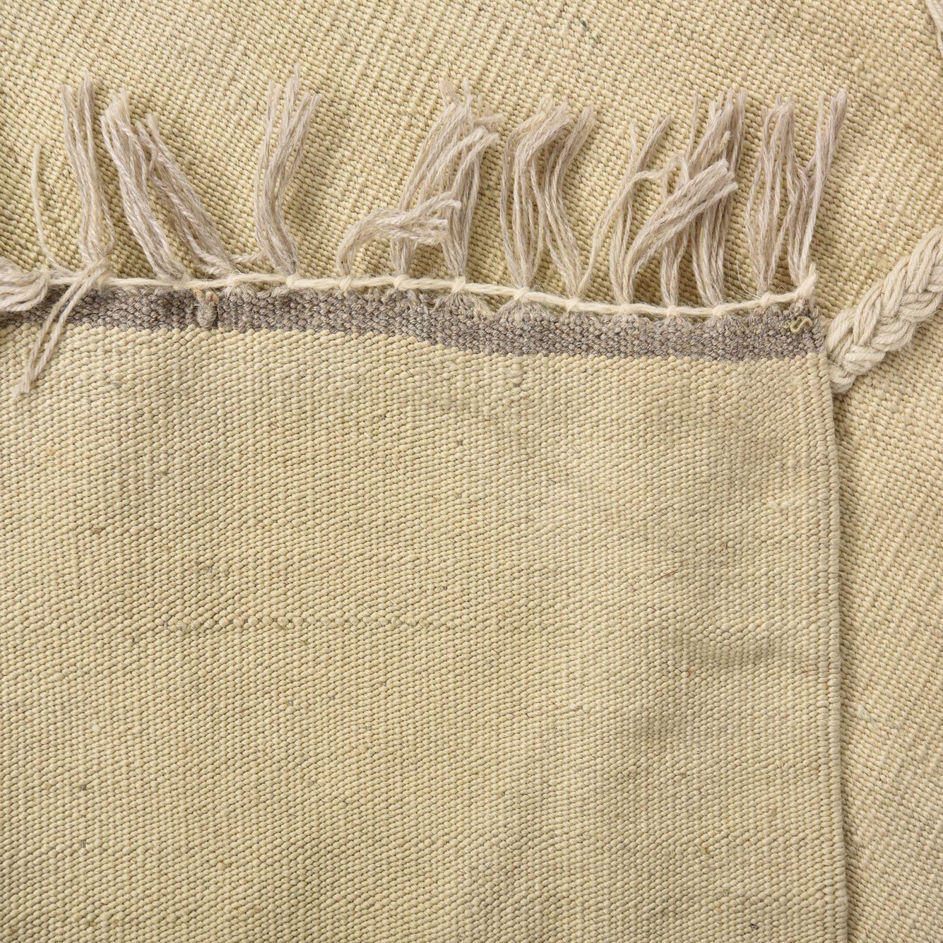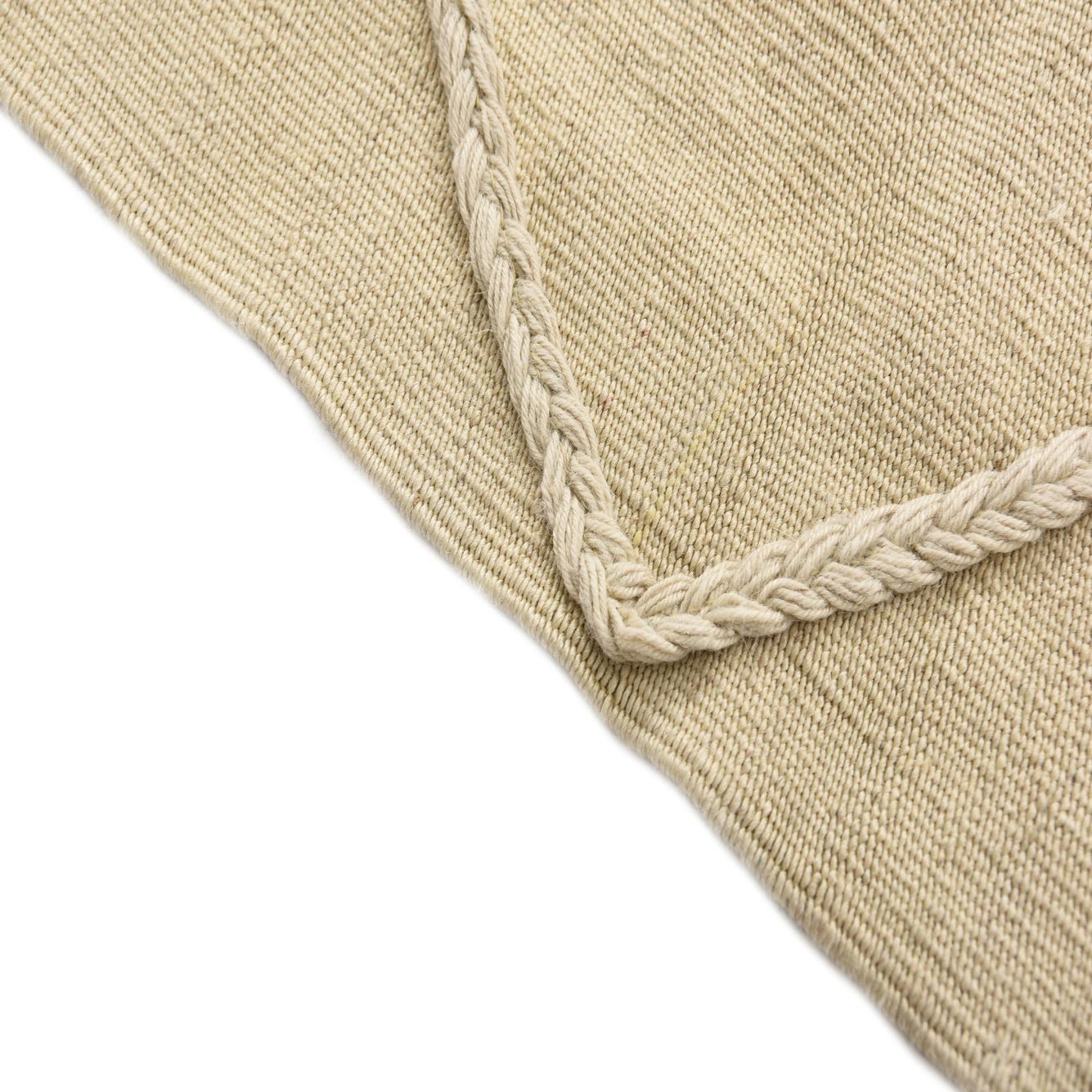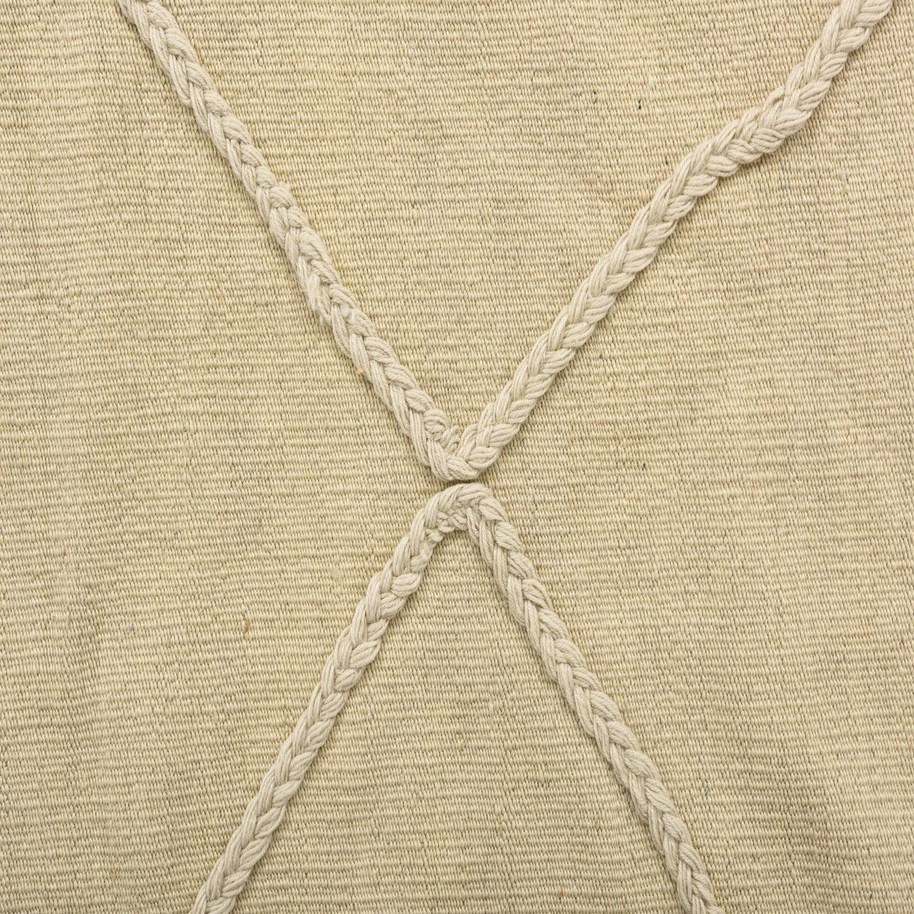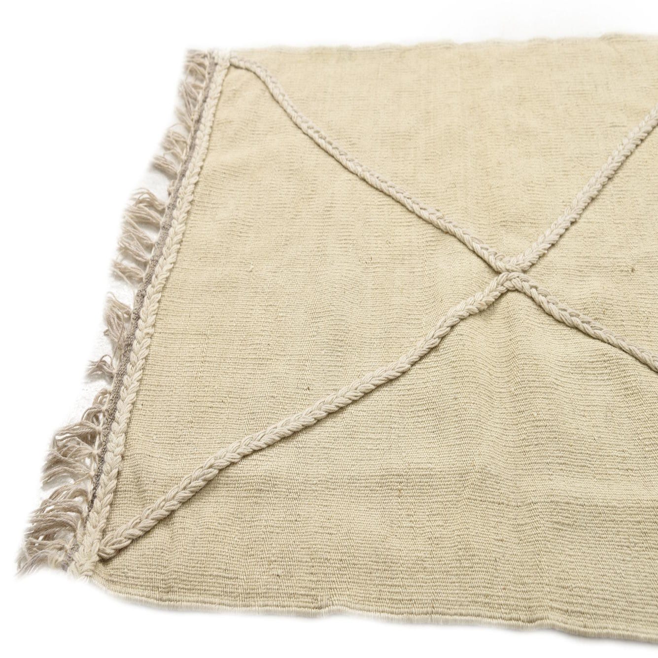 Hand-woven from 100% wool, this ivory runner pairs a smooth, flatwoven field with a raised braided diamond lattice that you can both see and feel. The monochromatic palette keeps the look calm while the hand-twisted cords add subtle depth and texture; short fringed ends reinforce the handcrafted character. The geometric pattern is clean and modern, with a gentle organic irregularity that gives the piece personality without dominating a room.
