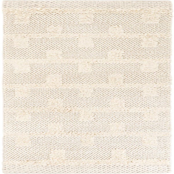 Ivory serves as a soft, neutral field for a subtle geometric texture: a hand-woven construction with a low, open weave base punctuated by raised, tufted lines that form a loose grid of rectangles. The contrast between the flat, slightly nubby ground and the plush, looped pile in the pattern creates a tactile surface you can feel underfoot, while braided accents at the ends add a finished, handcrafted touch. Made hand-woven of 70% wool, the rug offers natural warmth and a gently varied surface that reads as quiet and refined without adding visual weight.