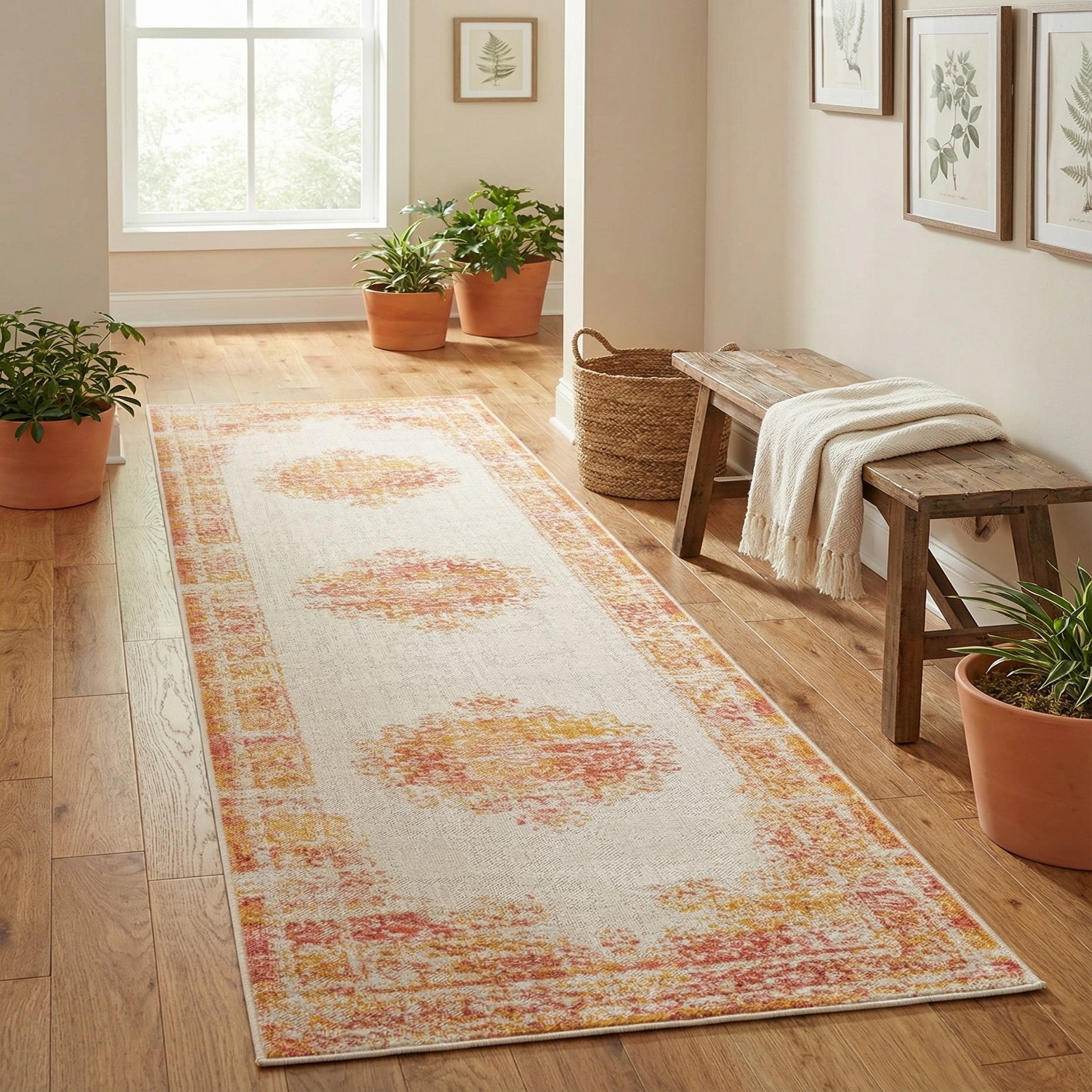 A 10 ft runner rug in ivory with distressed orange and yellow medallion patterns and a matching border, ideal for a hallway.