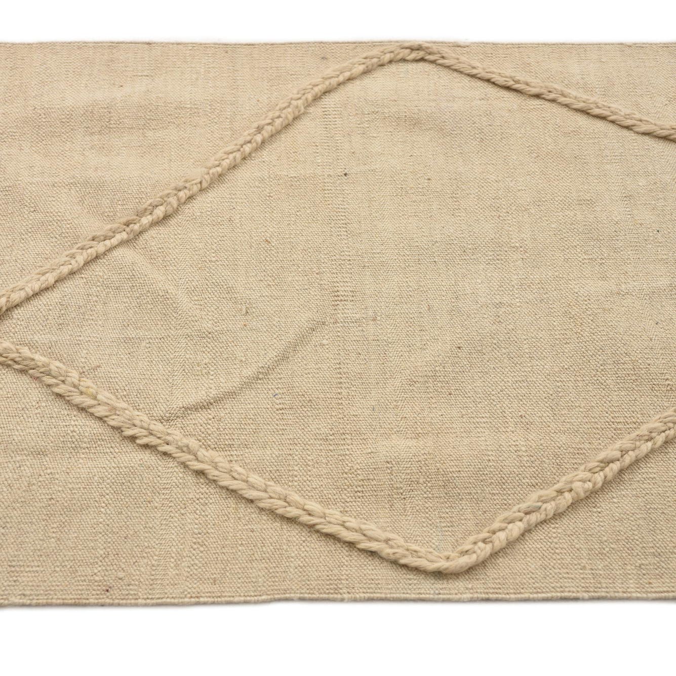 A soft ivory runner with a clean, elongated profile and a repeating braided diamond motif running down its center. Hand-knotted from 100% wool, the field is low-profile and tightly woven while the raised braided cords create a palpable, rope-like texture that invites touch. Short fringed ends add a casual finish, and the natural ivory ground carries subtle tonal variation that gives the piece depth without strong contrast.