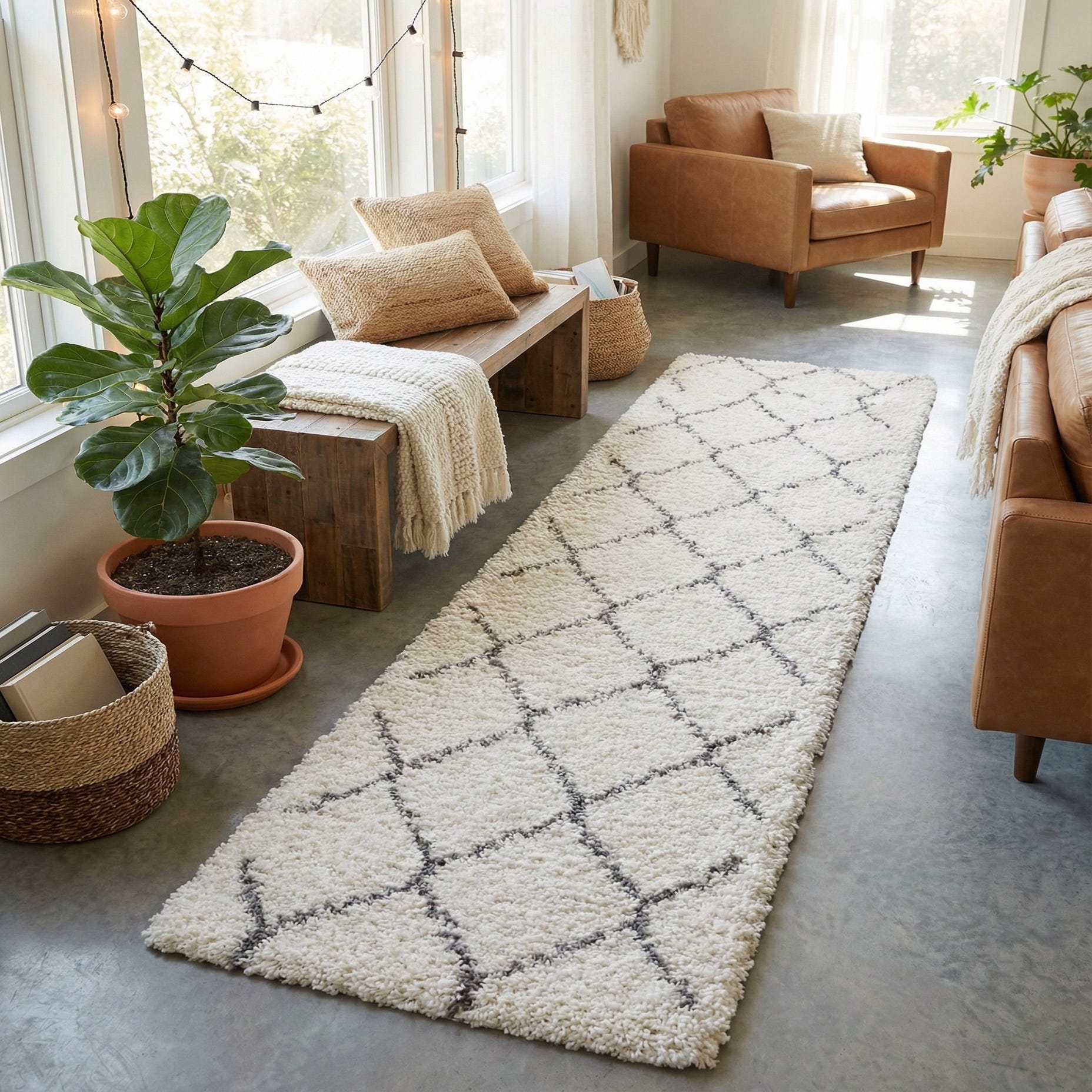 This runner works well in a long entryway or hallway to create a welcoming path, alongside a bed to add a cozy landing, or in a galley kitchen to soften hard floors. It pairs naturally with light wood tones, neutral upholstery, and minimalist or Scandinavian schemes, and can also complement modern farmhouse or casual contemporary decor when layered with textured linens and simple accents.