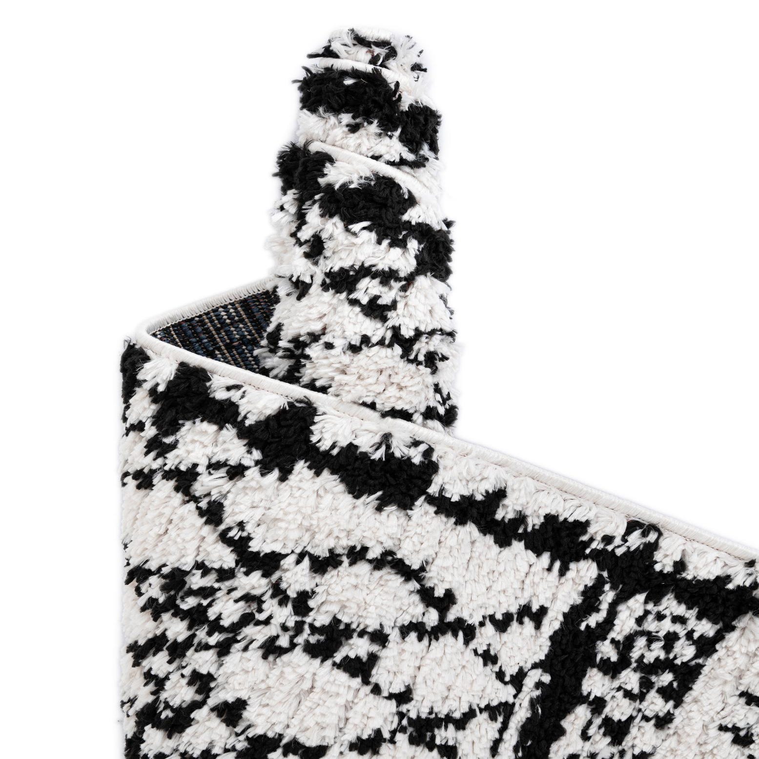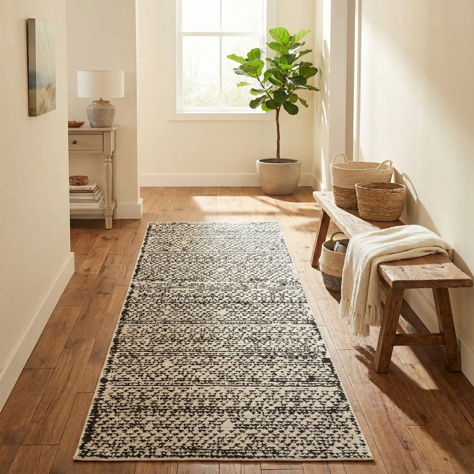 This runner works well in narrow spaces where you want visual interest without heavy color—hallways, entryways, and alongside kitchen islands. Pair it with light wood or concrete floors and matte black hardware for a contemporary look, or layer it over a larger neutral rug in a casual living area to add texture. It also complements minimalist, Scandinavian, and industrial schemes, providing graphic contrast to linen upholstery and natural-fiber accents.
