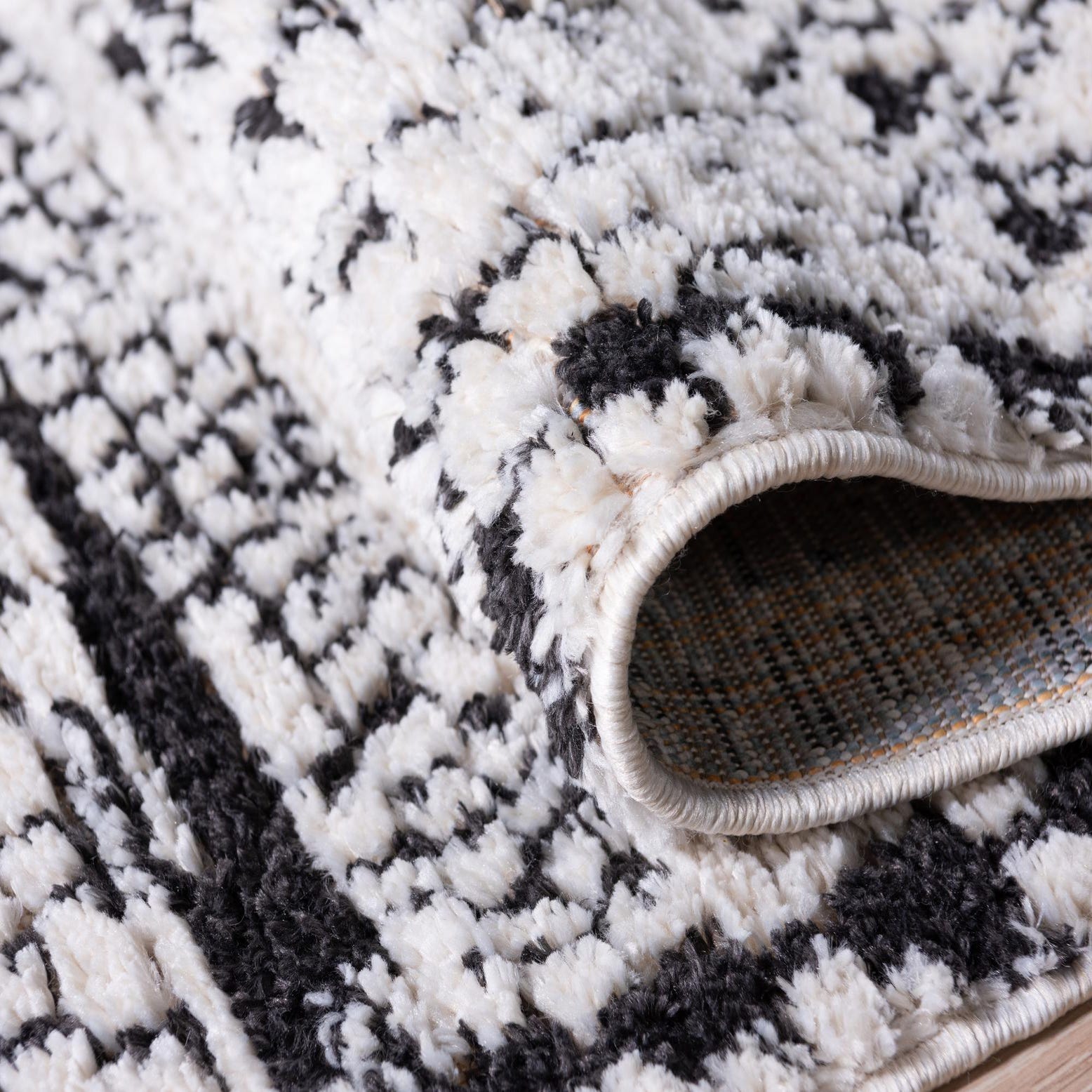 A textured ivory field provides a bright, neutral base while a scattered black geometric motif runs in understated horizontal bands across the length of the runner. The pattern mixes small triangle- and dot-like marks with narrow linear accents, creating a handwoven, slightly distressed look that reads modern-boho with global influence. Machine made from 100% polyester, the pile has a dense, low-to-medium profile that feels soft underfoot and shows a subtle, raised contrast where the black pattern fibers sit against the ivory ground.