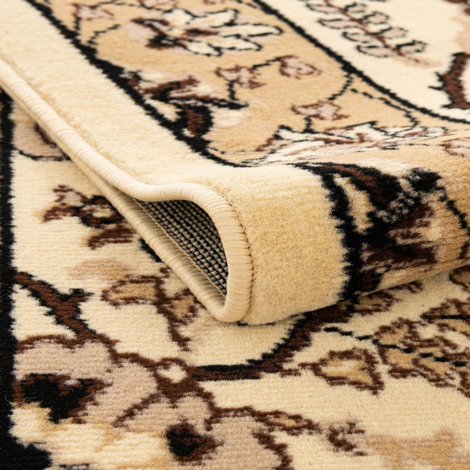 A classic Persian-inspired runner with an ivory field punctuated by scrolling vines, stylized rosettes and mirrored medallion motifs. Warm tan and beige tones build the primary design, while brown and black outlines add crisp definition against the cream background. A narrow tan border frames the pattern, giving the rug a balanced, traditional look that complements both light and darker floors. Machine made from 100% polypropylene, the low, tightly woven pile has a smooth, slightly lustrous finish that feels soft underfoot.