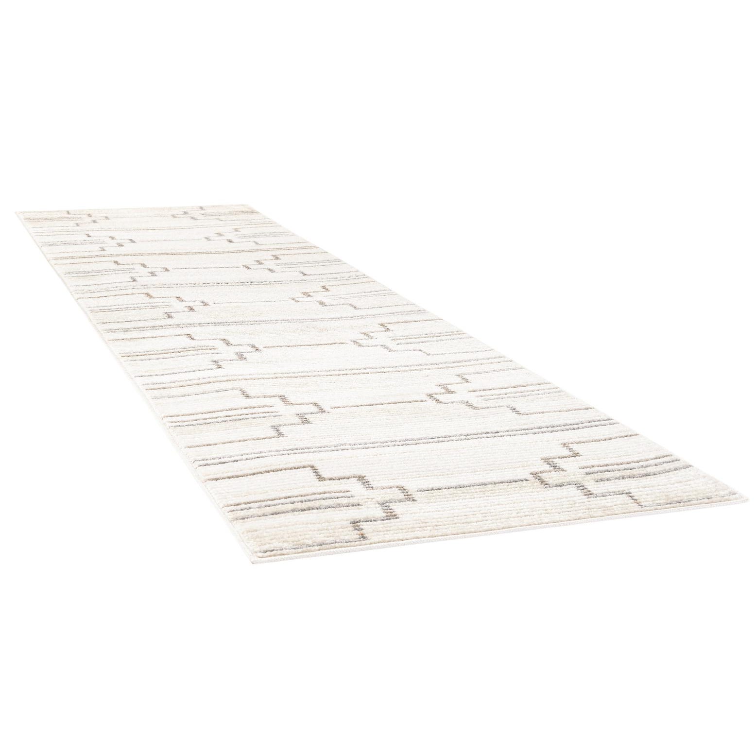 A 10 ft runner rug featuring a modern geometric pattern in shades of ivory, cream, and gray, ideal for a hallway.