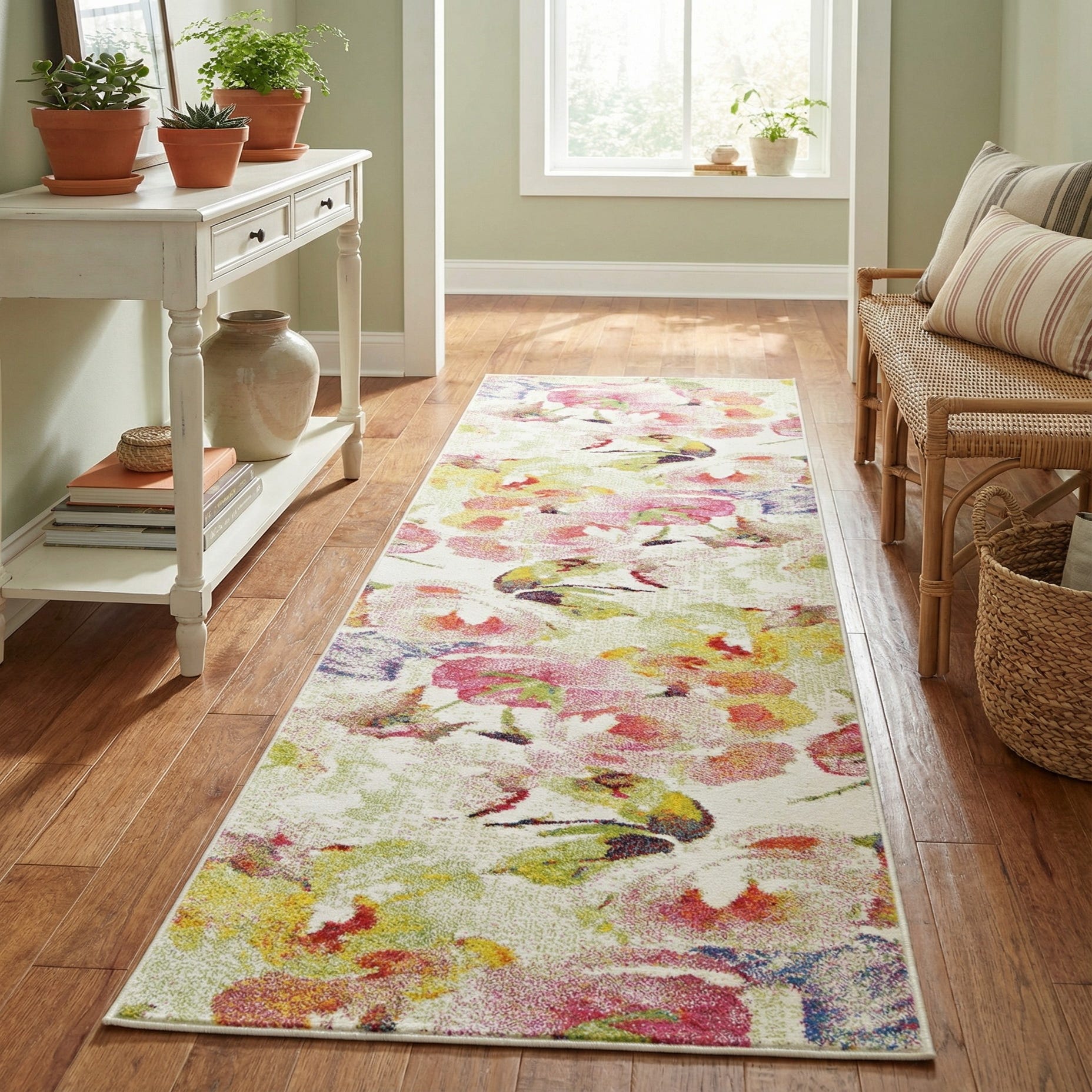 Soft against the foot, this machine-made runner is crafted from 100% polypropylene and presents a painterly floral pattern on an ivory background. Broad, watercolor-like blooms in pink, red, orange and yellow float across the field, while touches of blue and green add cool accents and leaf-like gestures. The surface reads with a low, dense pile that holds a finely speckled, almost pointillist texture—color variation is built into the weave so the pattern looks layered and dynamic without high relief.